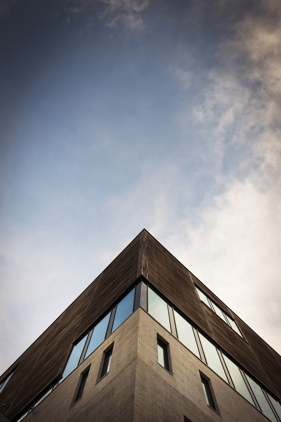 – Det ville blitt en stor utfordring om vi til stadighet måtte male eller olje kledningen. Fargen på termoasken gjør at bygget fremstår som helhetlig i overgangen mellom betong, glass og tre. Vi følger spent med på hvordan fargen endrer seg med tiden – i begynnelsen var den mørk rødbrun, men nå har den blitt lysere, og slik jeg forstår det vil den ende opp i en sølvgrå tone, sier Masdalen, som også har lagt merke til at fargen skifter med vær og vind.
