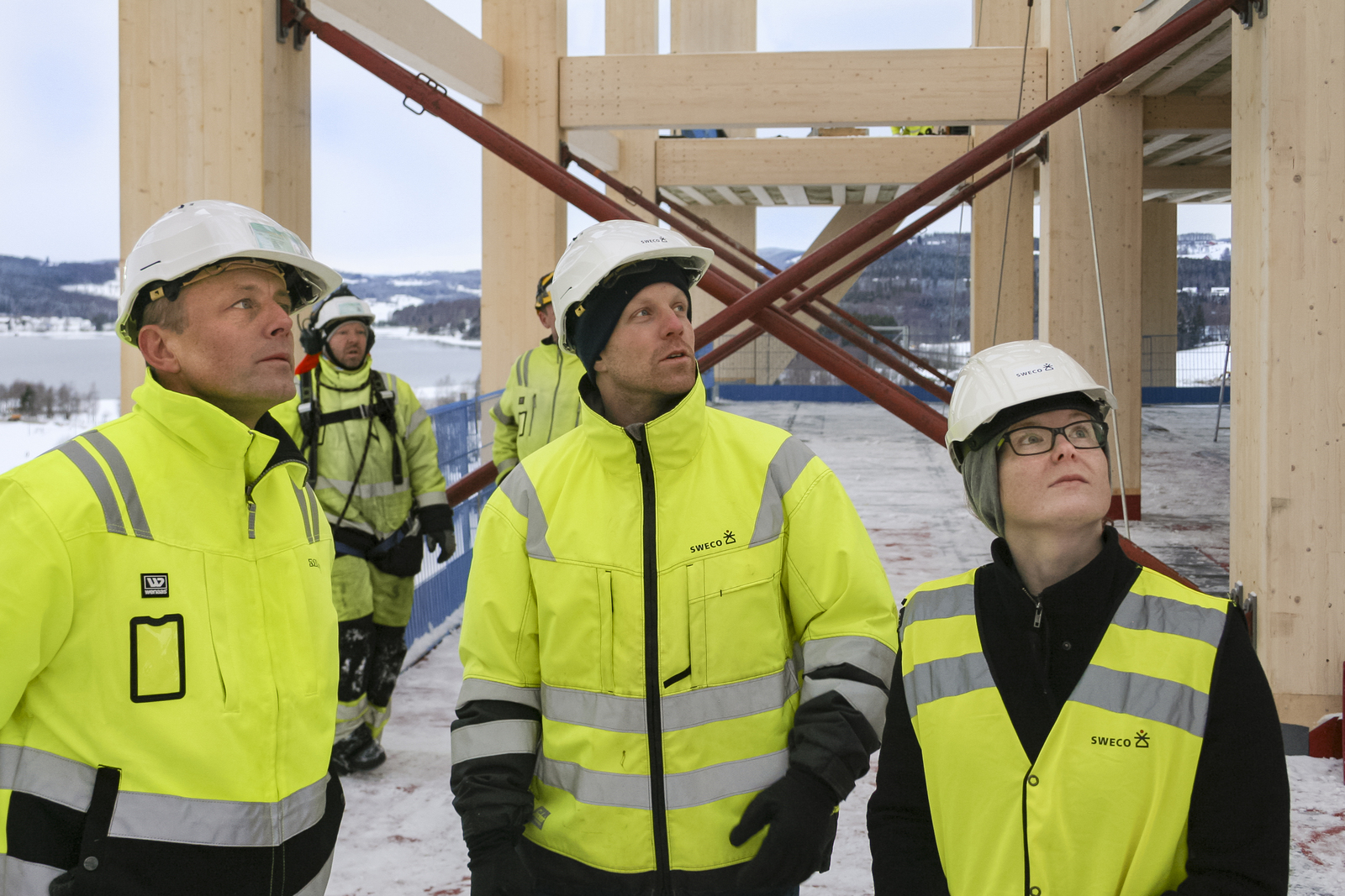 Abrahamsen ser oppover mot den foreløpige toppen av Mjøstårnet på 52 meter. Han sier at for Moelven Limtre er Mjøstårnet i teknologisk forstand en oppreist trebru. Abrahamsen står sammen med de rådgivende ingeniørene Magne Aanstad Bjertnæs og Alvdis Hardeng fra samarbeidspartneren Sweco.