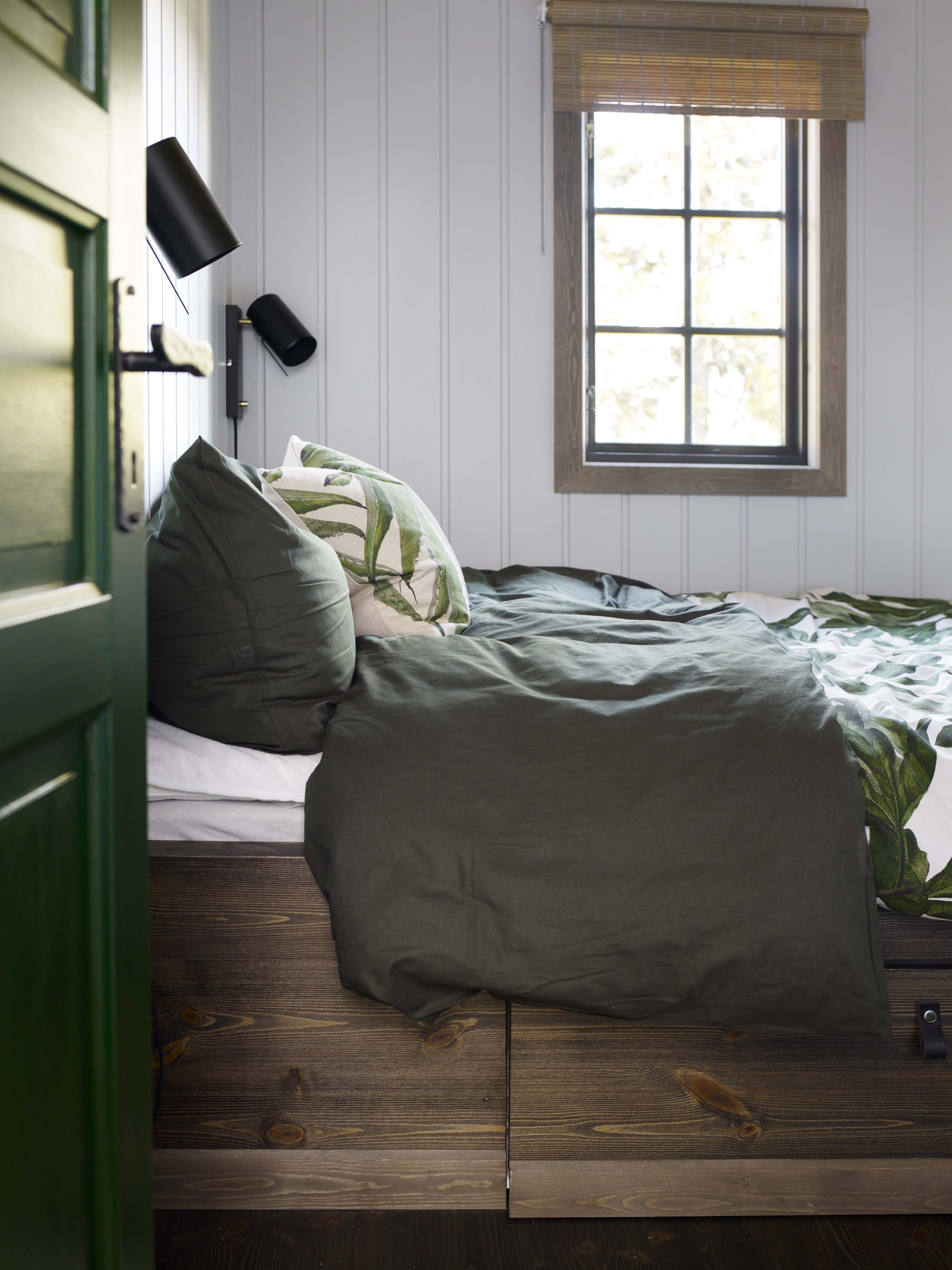 Sengegavlen er selvsnekret ved å bruke gulvbordene i furu, oljet i fargen Etna, et grep som skaper fin helthet i hytta. Det hele etter ide fra interiørdesigner Siv Brenne. Foto: Per Erik Jæger
