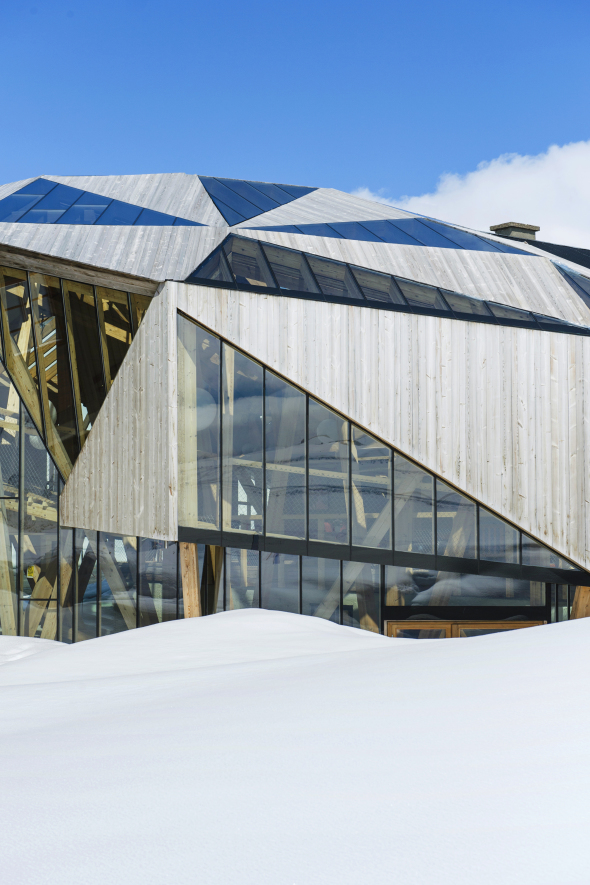 Takkonstruksjonen er en abstraksjon av Sognefjells-været. Den skaper en egen stemning i rommet, der lys og skygge skifter i en slags hurtigfilm.