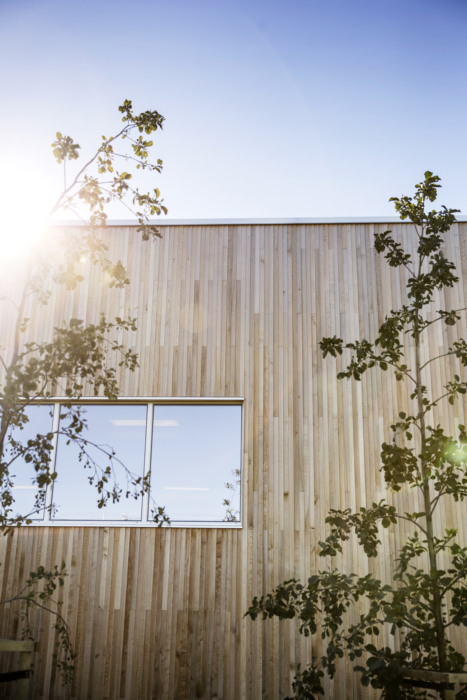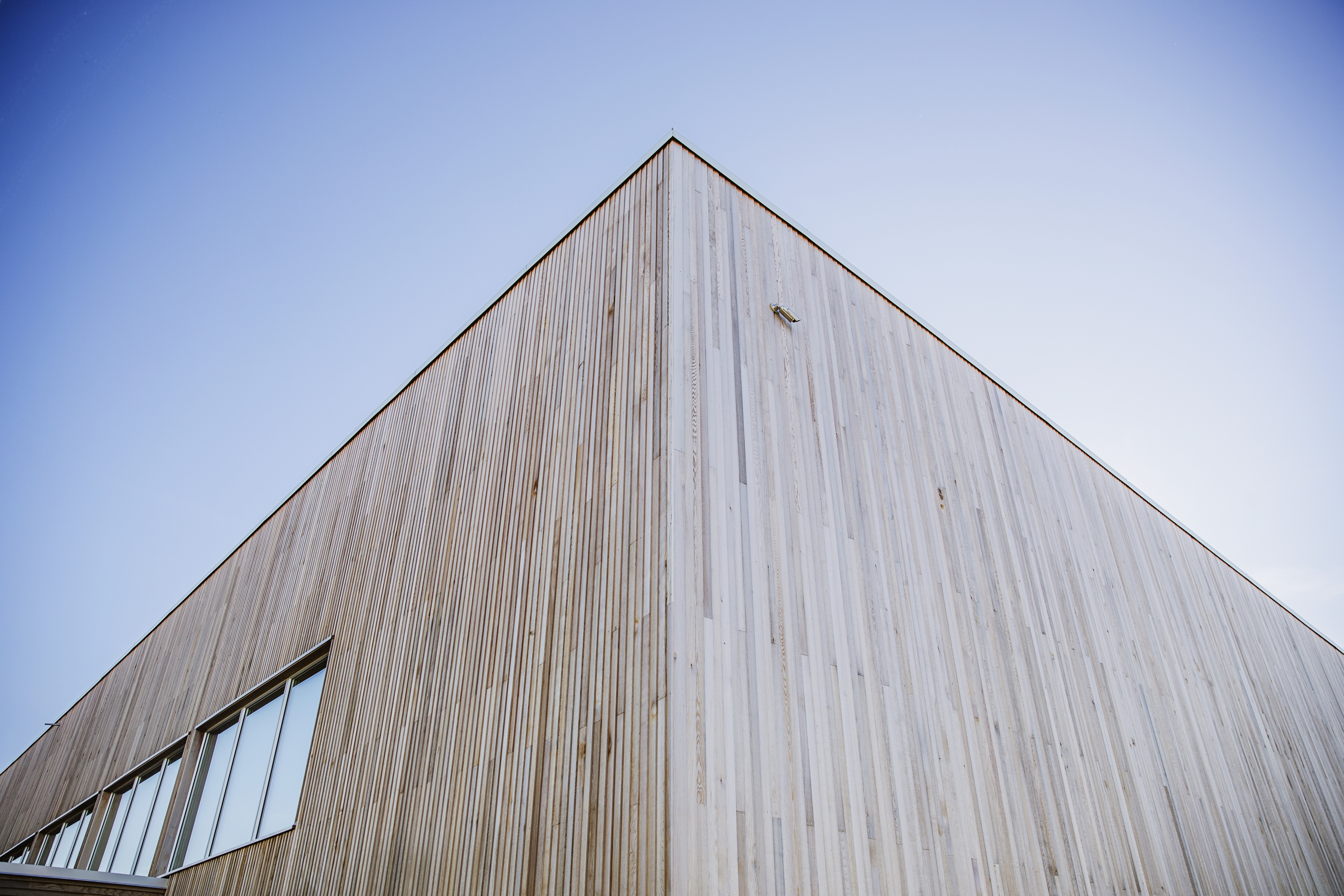 Det kan være litt overveldende for barn å begynne på en stor, ny skole. Ved å kle bygget med tre både innvendig og utvendig bruker vi treets estetiske egenskaper som et virkemiddel for å forminske den opplevde størrelsen av bygget. Trekledningen er også et pustende element som gjør at de klimatiske forholdene blir mer stabile