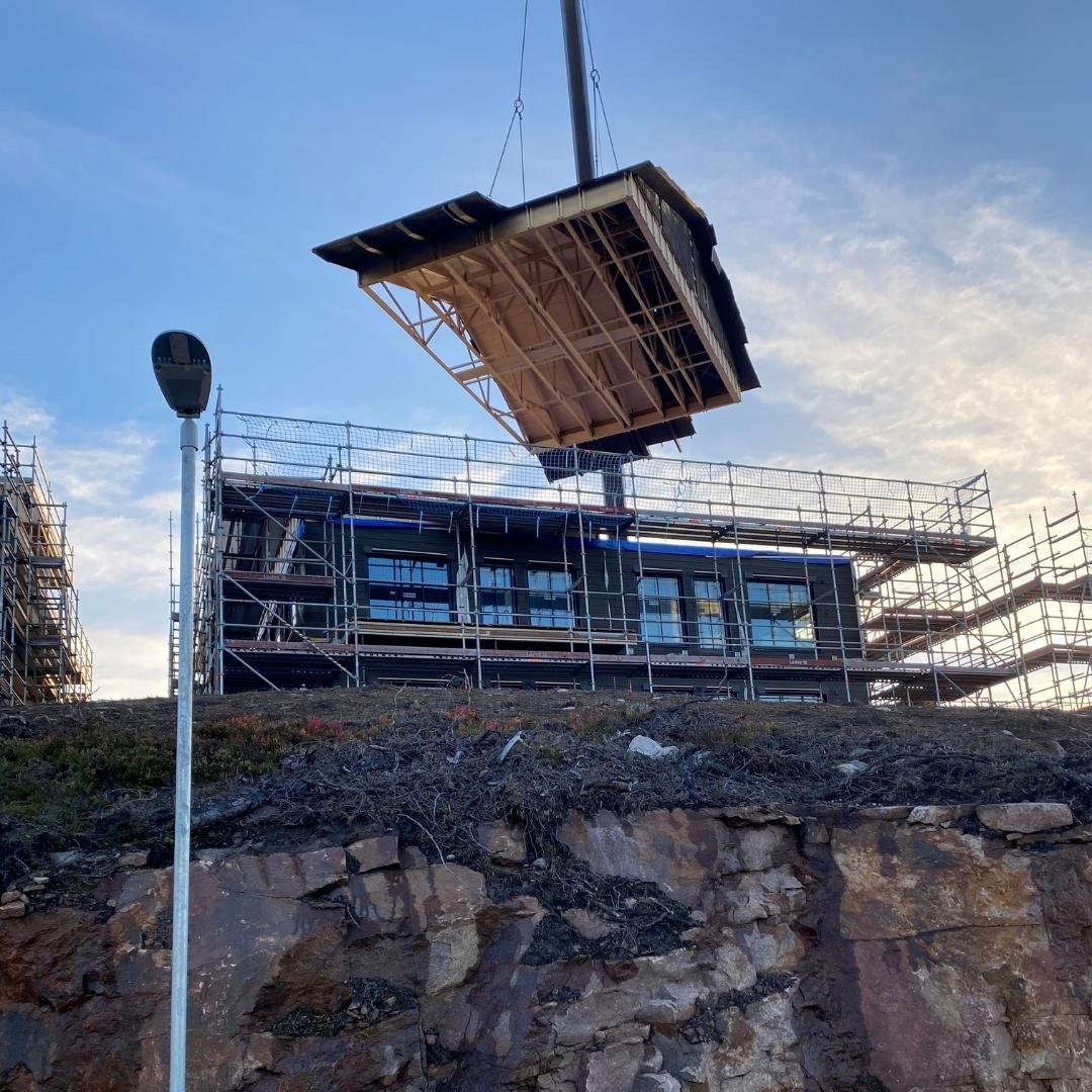 Vecka 39, 2022 rullade den första modulen från fabriken i Torsby mot toppen av Branäsberget och redan vecka 46 väntas de tolv huskropparna vara taktäta. Därefter återstår enbart färdigställande och ihopkoppling av system, men innan vintern är slut väntas bostadsrättsinnehavarna kunna tillträda sina lägenheter.