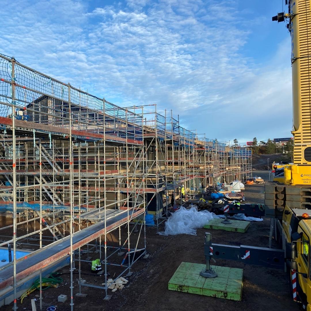 De måttanpassade modulerna transporteras sedan ut till byggplatsen och lyfts på plats med millimeterspassning på bara några veckors tid. I nästa steg kopplas alla installationer ihop och sista handen läggs på tak och fasad.