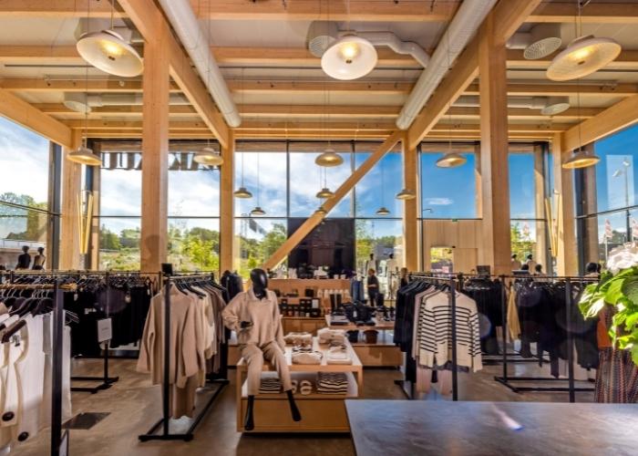 Det är inte bara byggnadens något annorlunda form som sticker ut, det är även en byggnad som genomsyras av trä. I Nodi har man valt att exponera så mycket som möjligt av både limträstomme och trädetaljer. Att bygga med trä genererar inte bara ett lågt klimatavtryck, det skapar också en trivsam inomhusmiljö.
