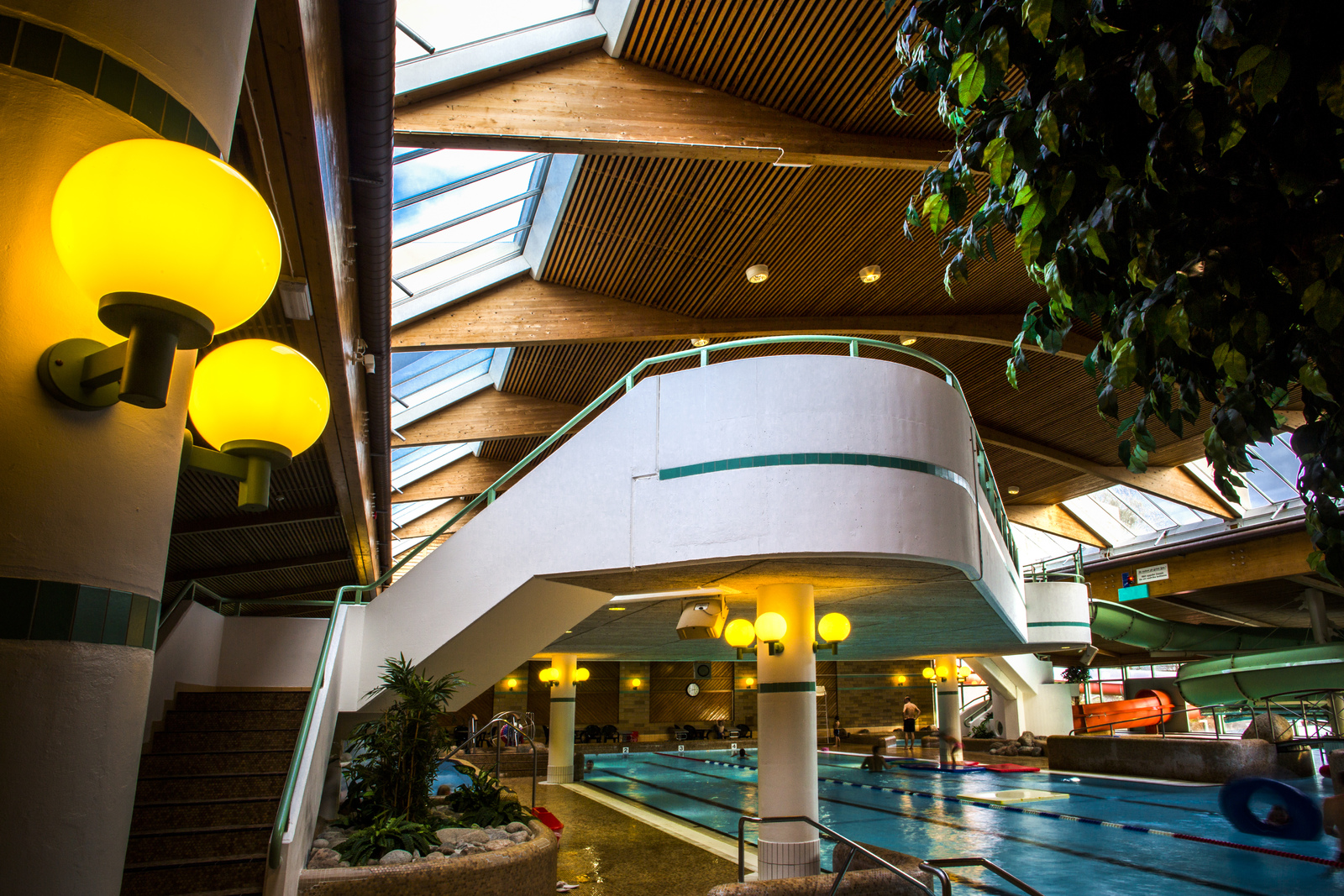 Allt från äventyr till avkoppling i detta sköna bad inramat av fina limträbalkar som ger en skön atmosfär!