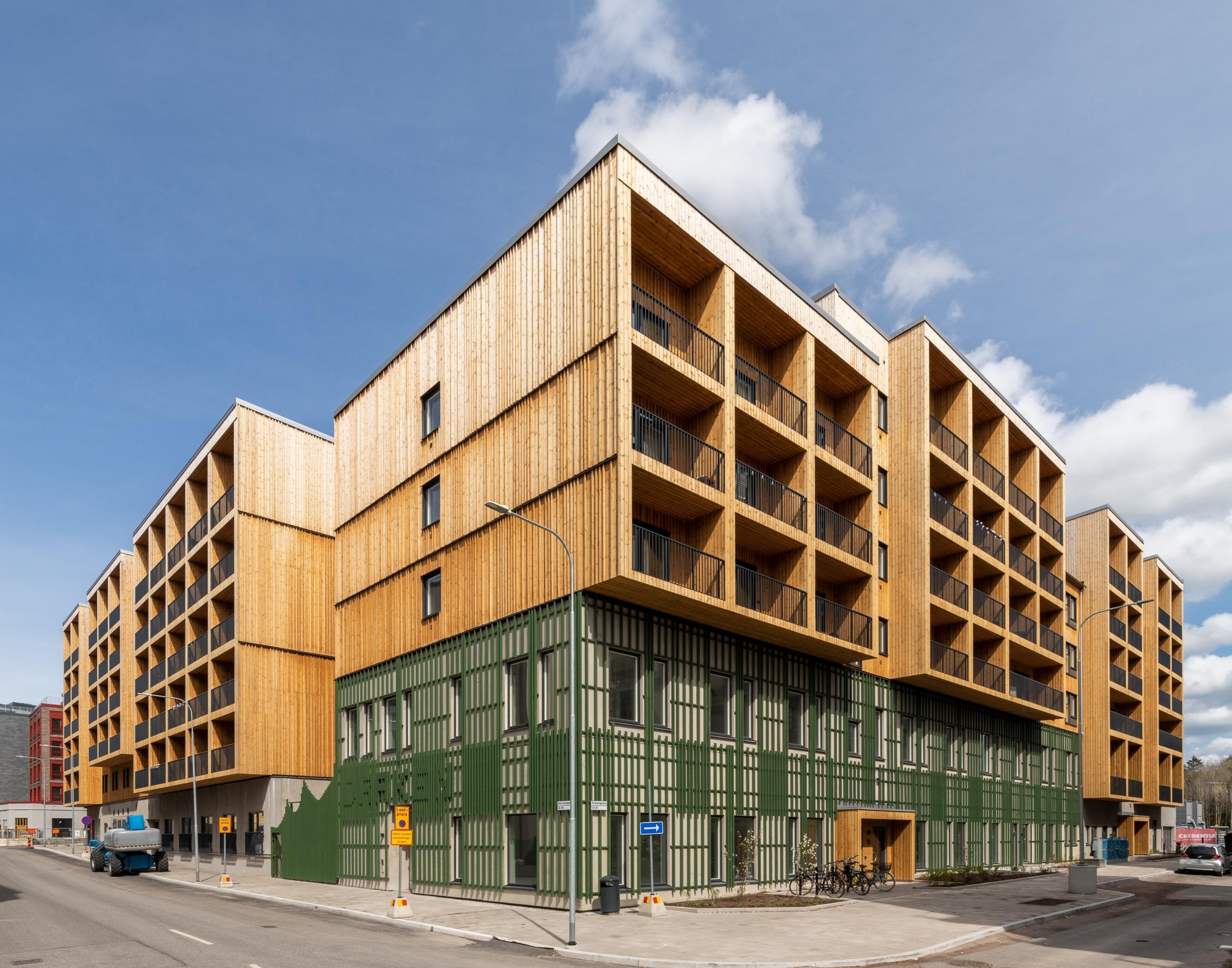Fördelarna med rätt material på rätt plats är många. I vårt projekt i Barkarbystaden ligger fokus på hållbarhet, estetik och funktionalitet. De stora träfasaderna är ett välkommet inslag i den i övrigt betongtäta stadsdelen. Men utöver att det nya kvarteret moderniserar stadsbilden gör husen också ett viktigt jobb för klimatet i stort och miljön för de boende i området. Trämaterialet fångar nämligen upp och lagrar koldioxid samtidigt som det har en naturlig ljudabsorption.