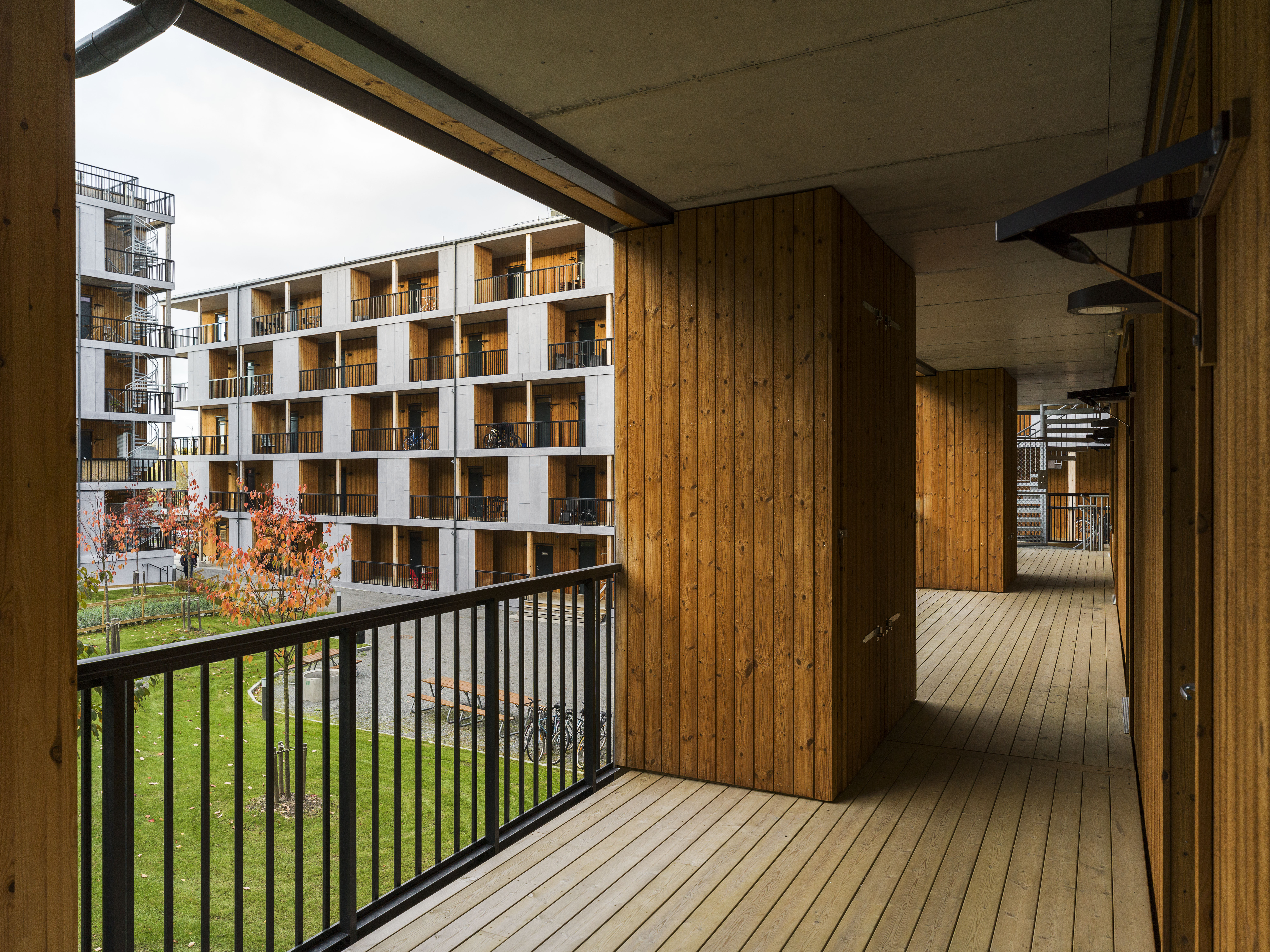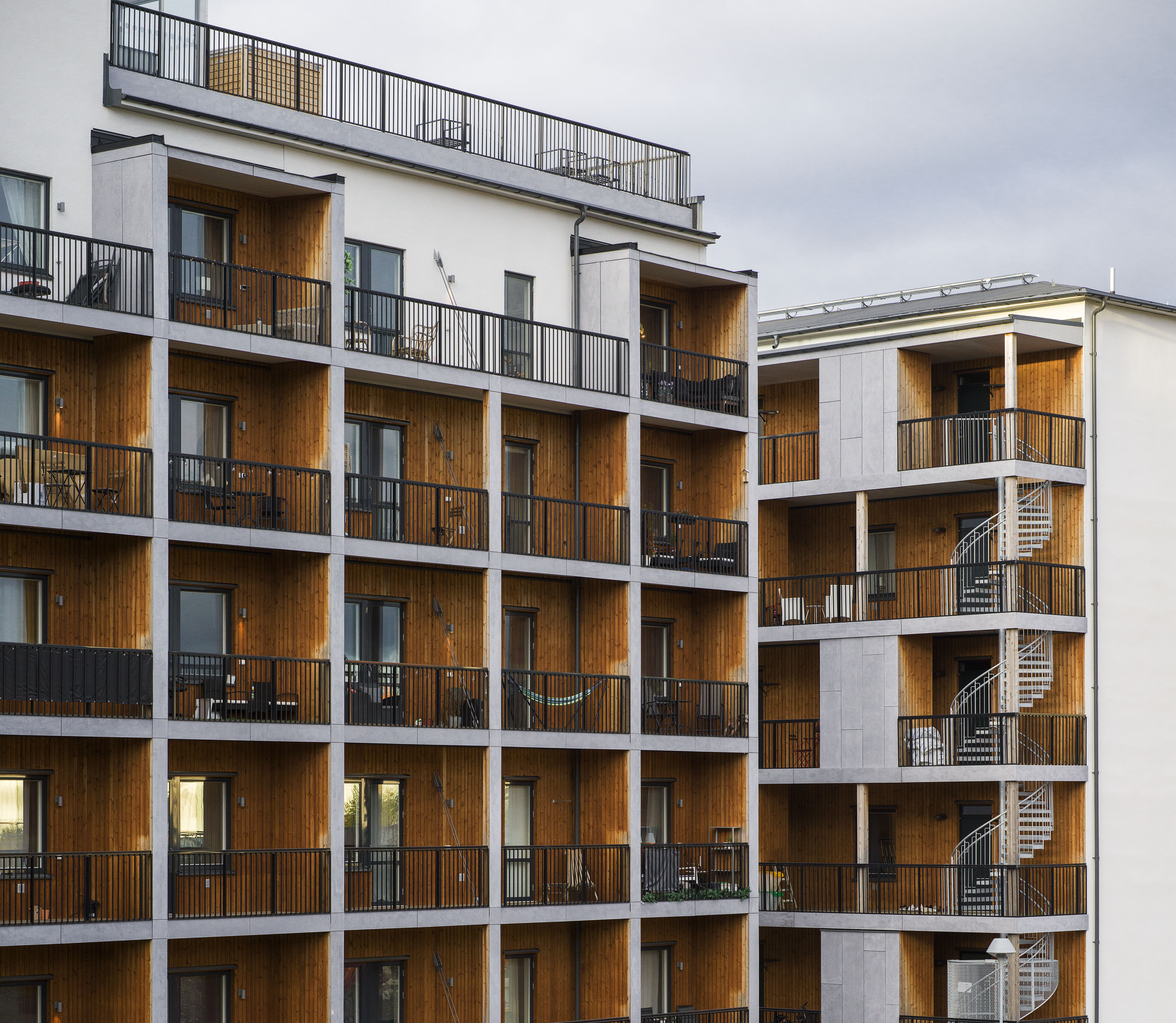 Modulariserade hus uppbyggda av ett fåtal olika lägenhetstyper som bidrar till ett kostnadseffektivt och snabbt byggande. De generöst djupa loftgångsfasaderna möjliggör plats för rekreation och umgänge. Träpanelen förstärker det ekologiska avtrycket som man uppnår av att bygga hus i naturliga material. I kombination med skivfasad och puts skapas en spännande dynamik i fasaderna.