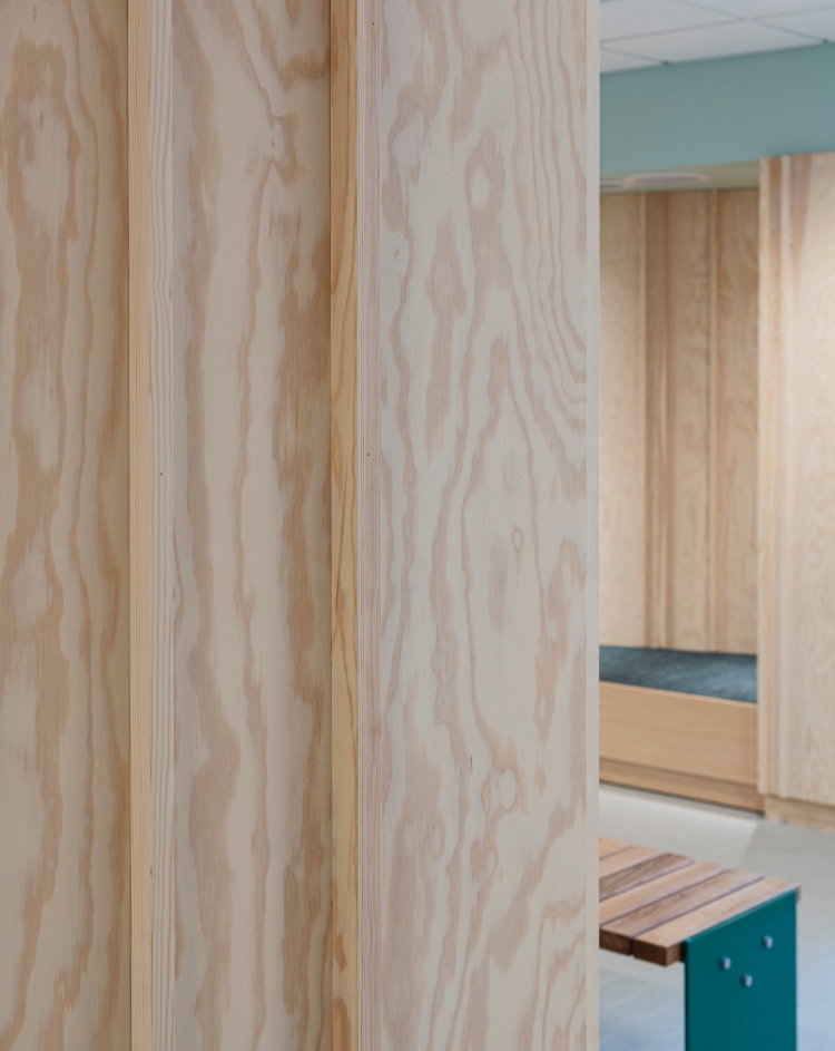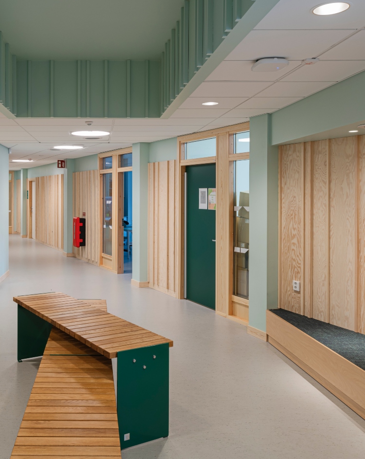 I Silverkällan har man valt naturligt trä i form av Moelven Studiopanel på väggarna. För att få in mer färg är utvalda delar av väggar och inredning kulörsatta. Kombinationen av trä och kulörer skapar ett lekfullt lugn