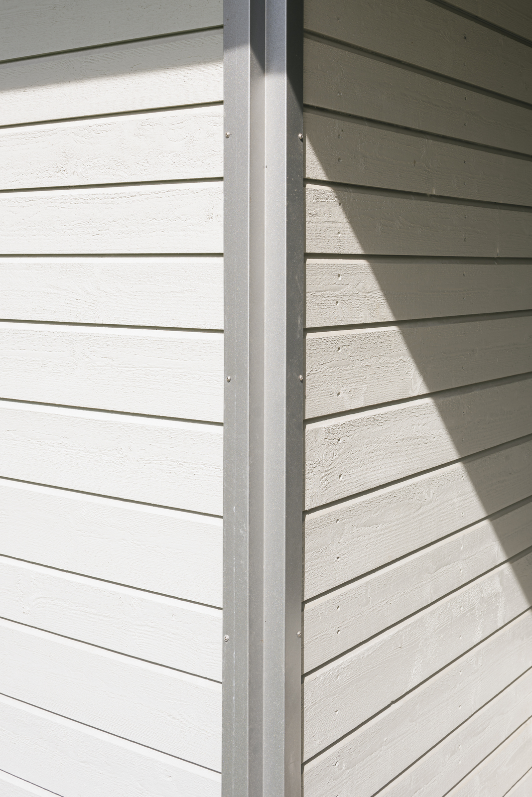 Granpanelen är en enkelfasprofil med not och spont. Brandimpregneringsmedlet är Fireguard och virket levererades både grundmålat och mellanstruket. Det finns även flera andra träslag och utseenden man kan kombinera till en större brandskyddad träfasad.