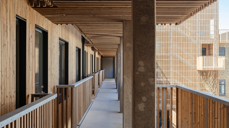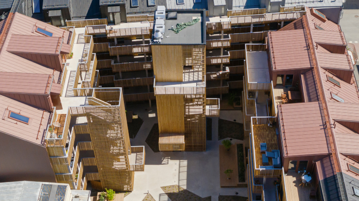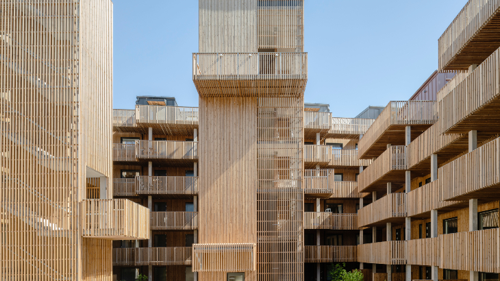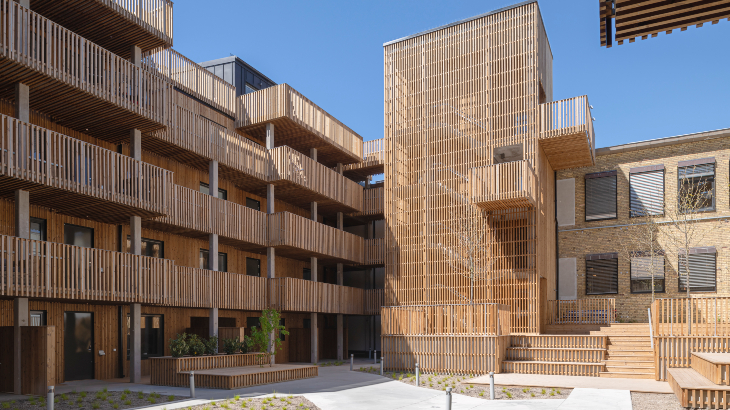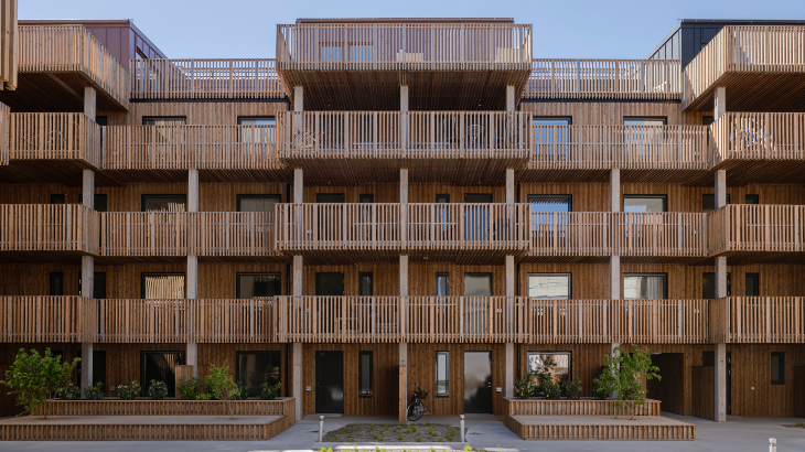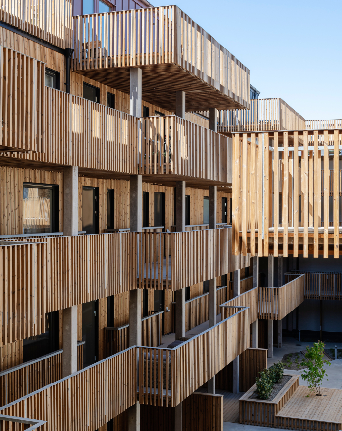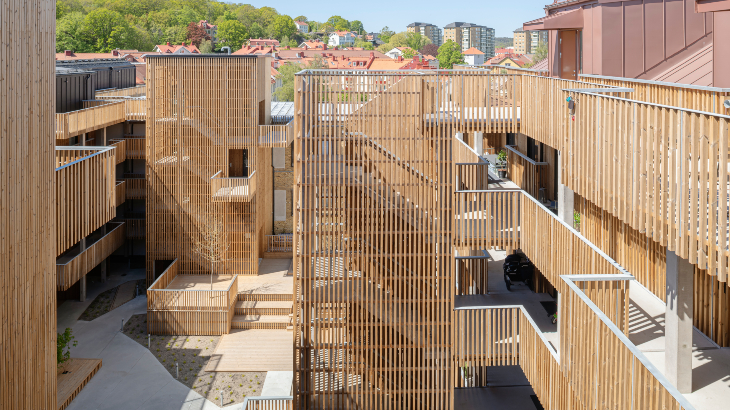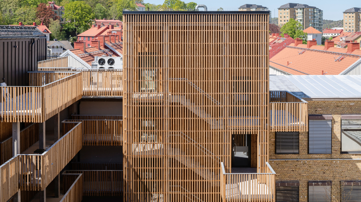 Spektakulärt träprojekt! Med hållbarhet i fokus hamnade valet på svanenmärkt värmebehandlad furu som pryder fasaden och ger innergården en vacker helhet. Träpanelen och ribborna är dessutom brandskyddade.