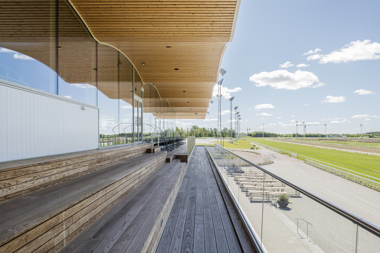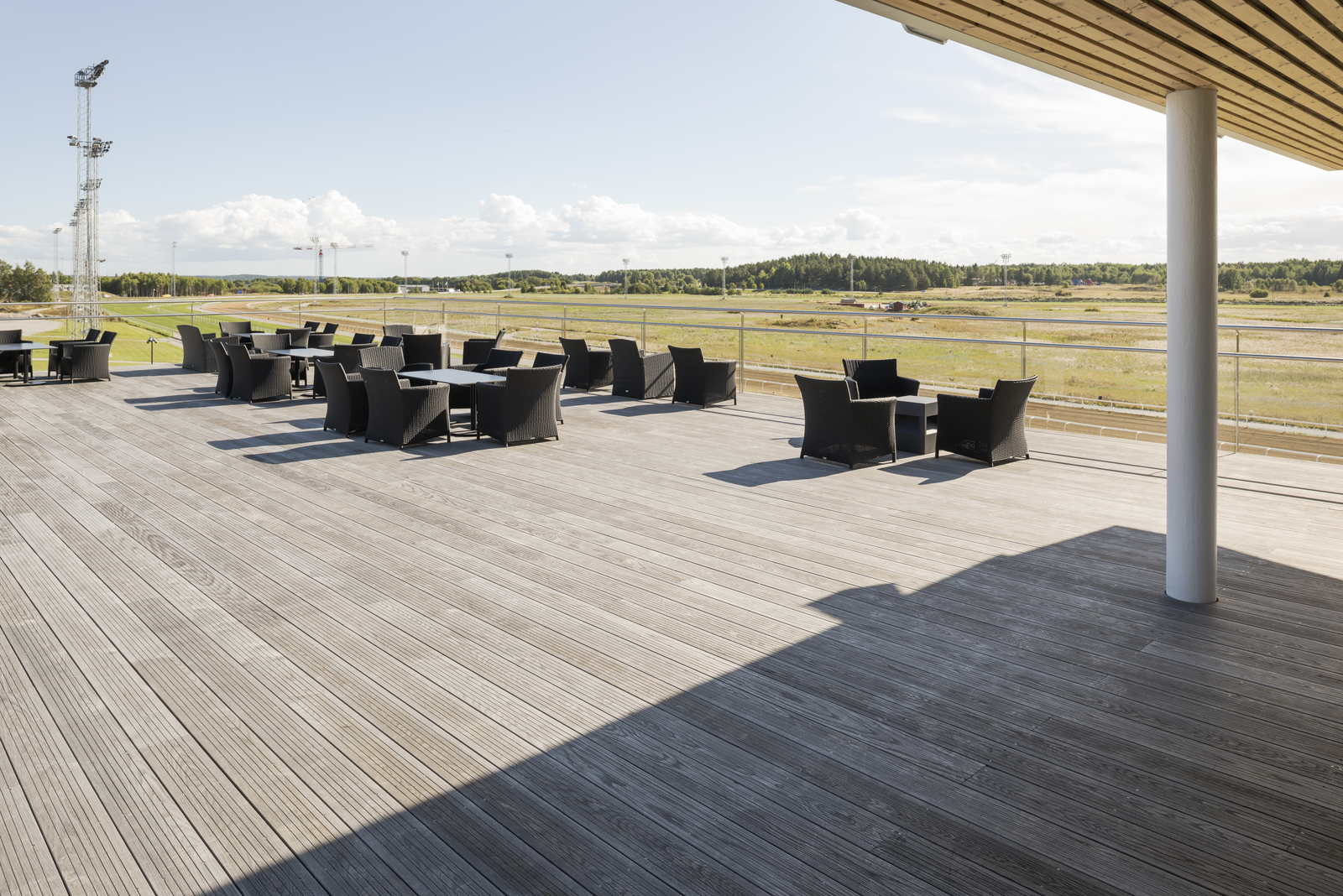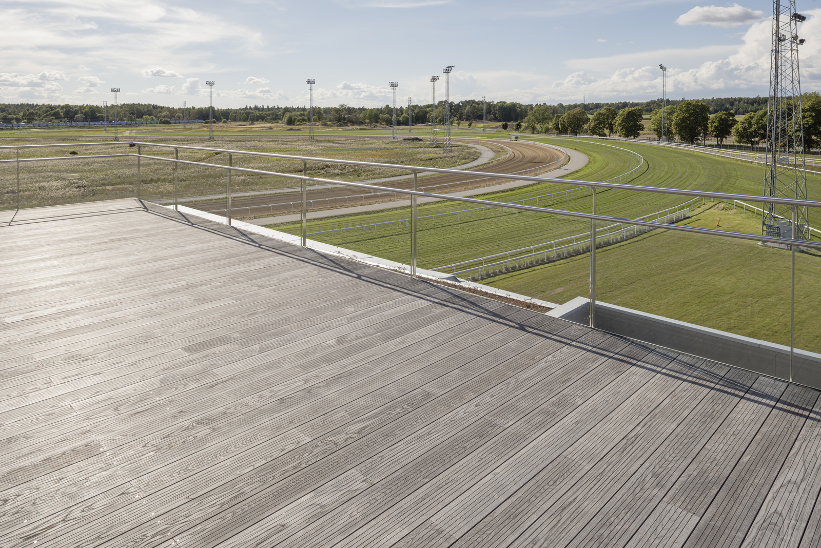 Värmebehandlad ask, s.k. TermoAsk, på stora terrassytor vid Sveriges huvudstadsbana för galoppsport. Den obehandlade trallen har åldrats på ett naturligt sätt och fått en vacker silvergrå nyans.