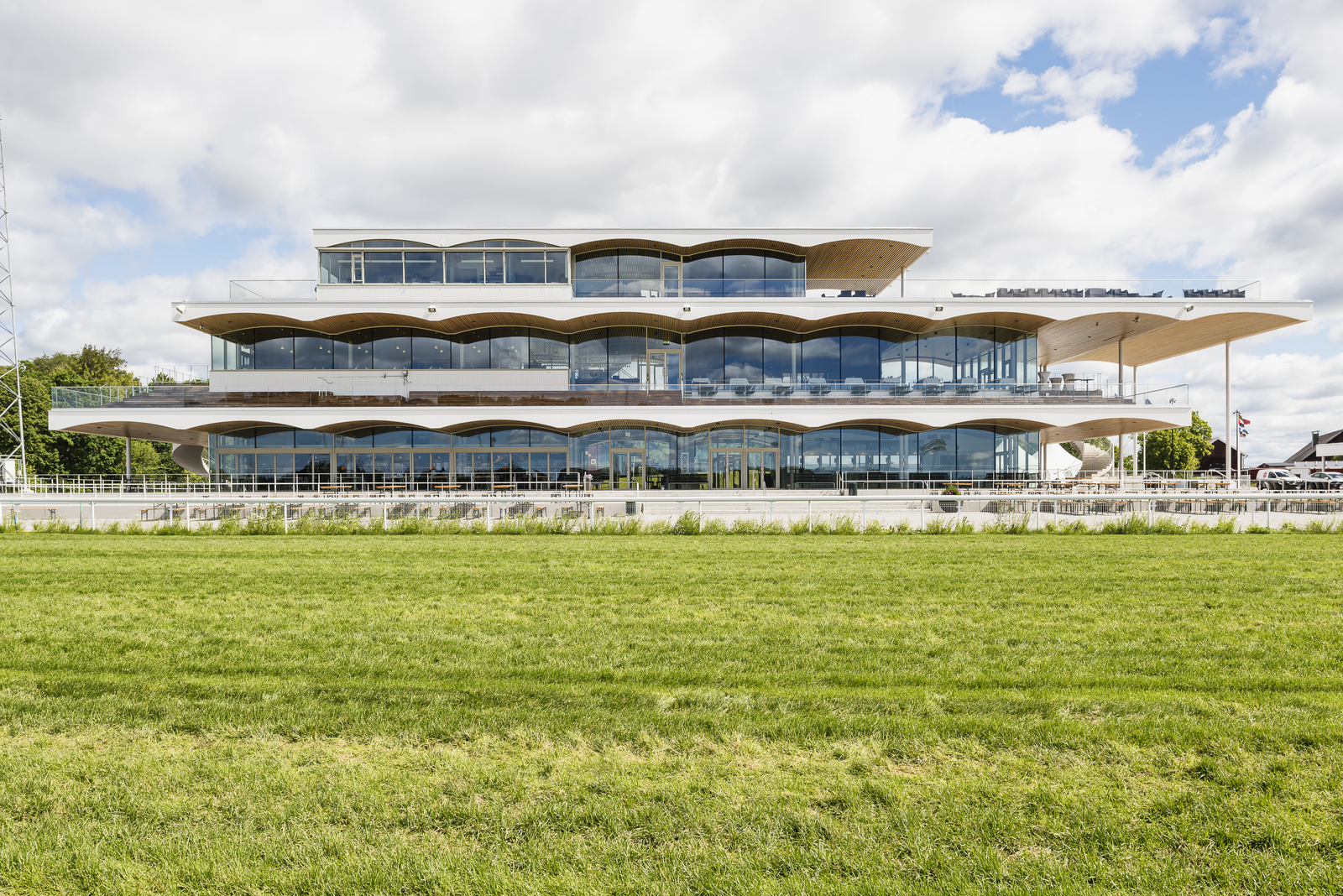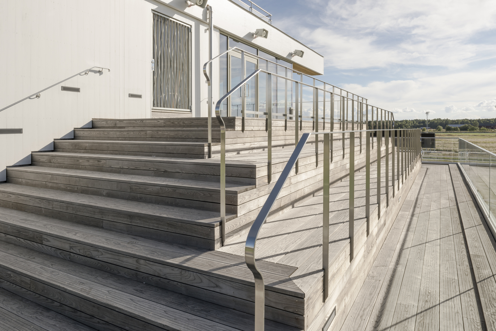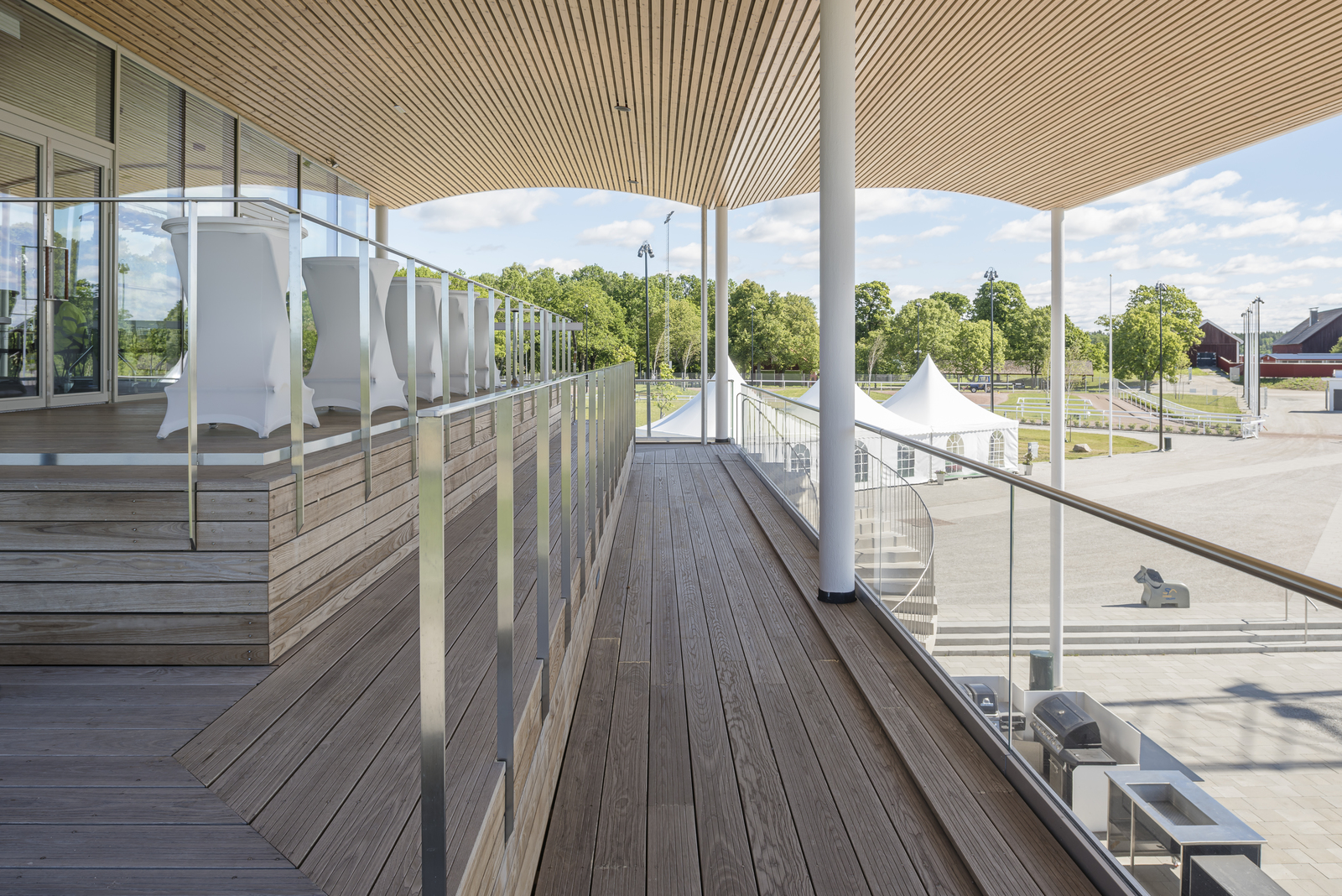 Värmebehandlad ask, s.k. TermoAsk, på stora terrassytor vid Sveriges huvudstadsbana för galoppsport. Den obehandlade trallen har åldrats på ett naturligt sätt och fått en vacker silvergrå nyans.