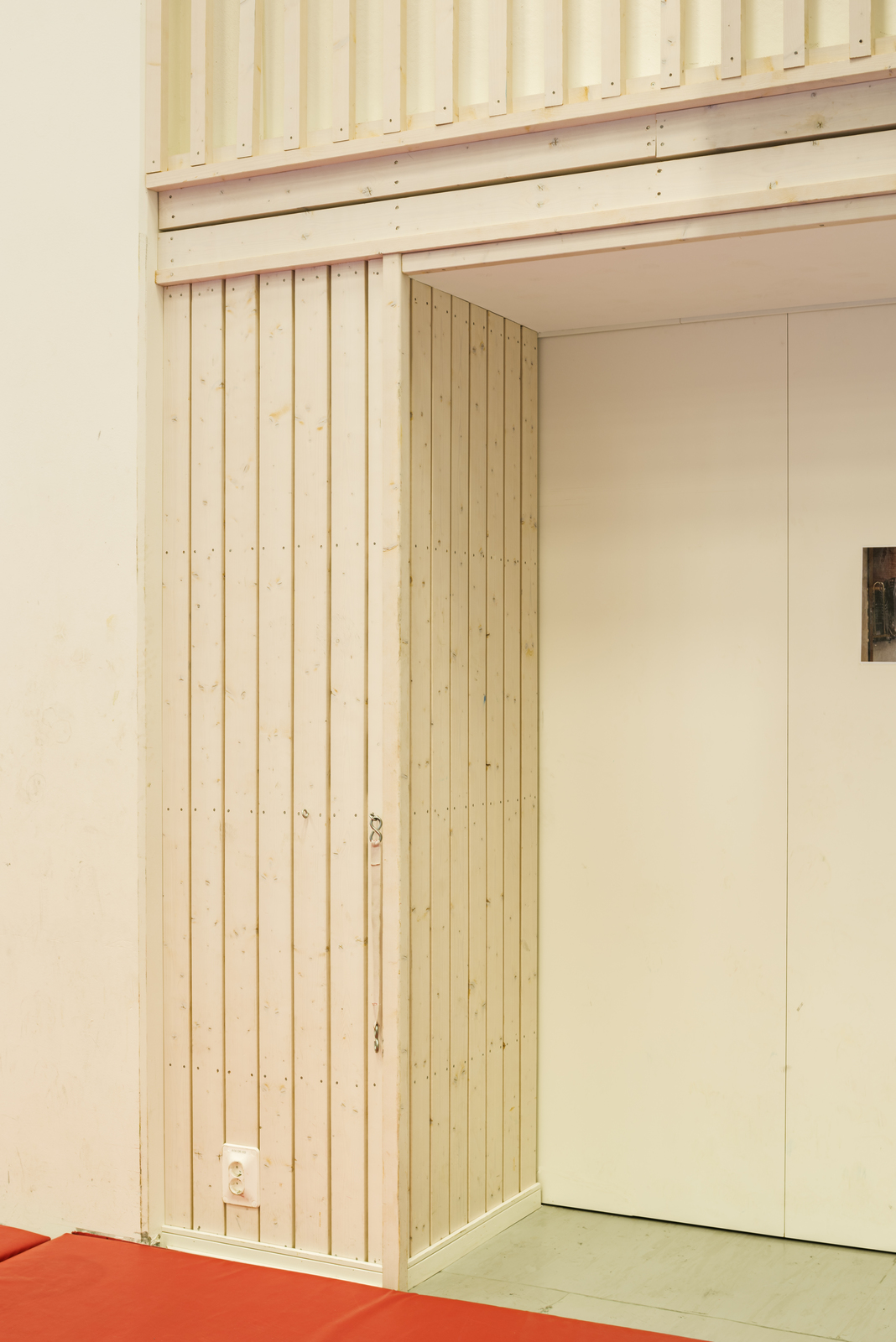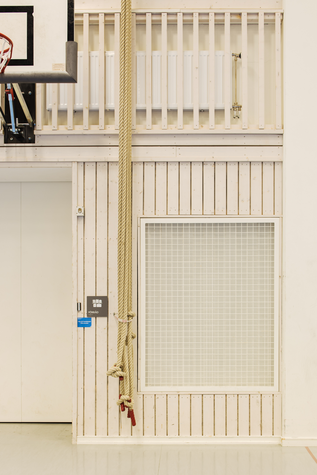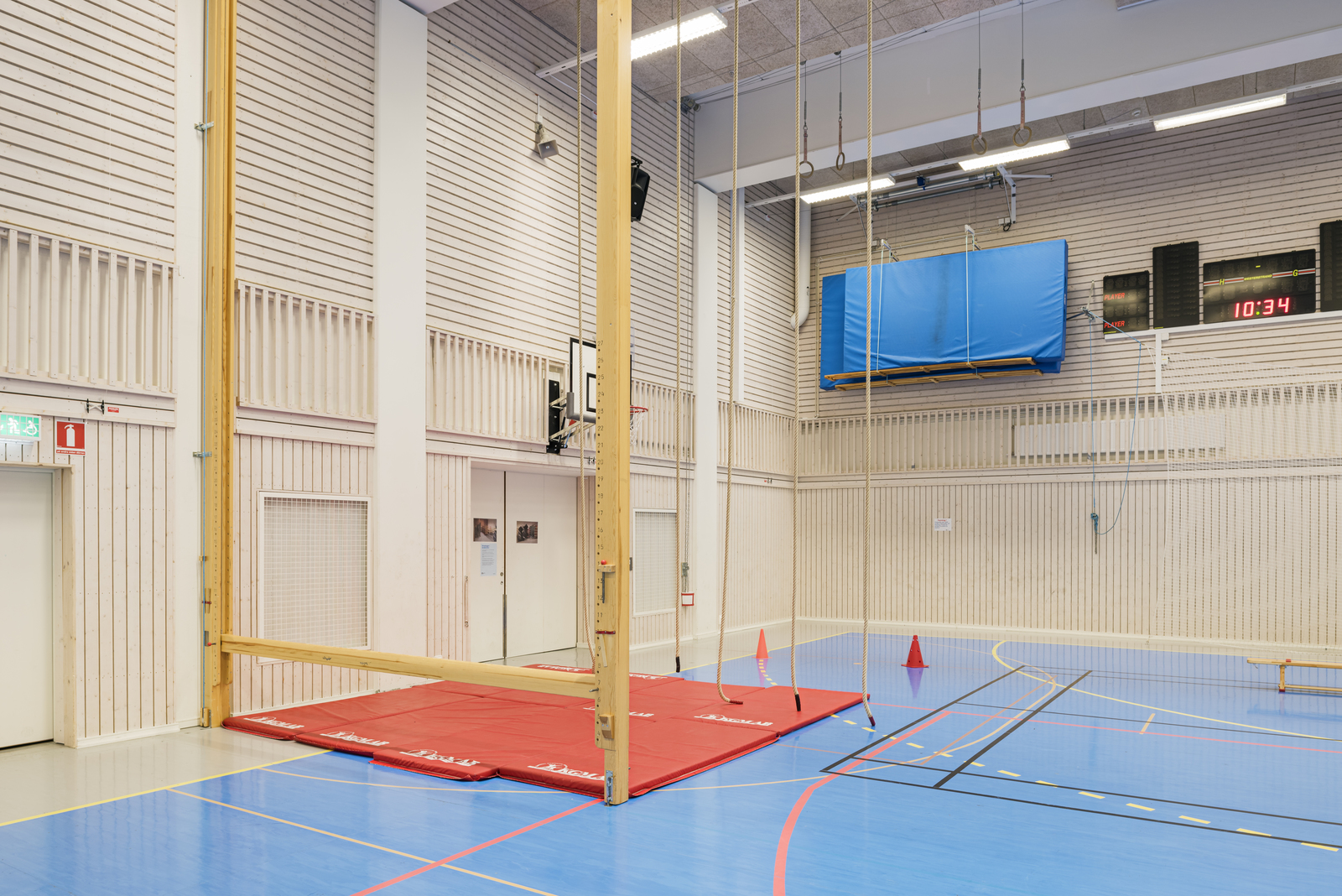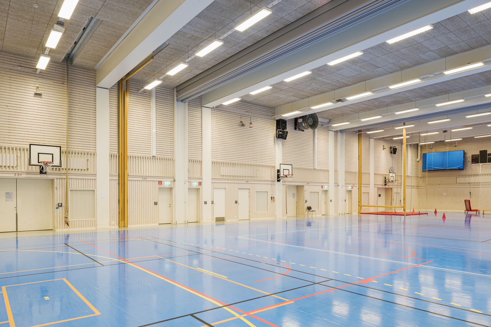 Nybyggnad av idrottshall på Östermalm. Interiörpanelen består av gran som är brandimpregnerad och klarlackad med 7% vitpigment.
