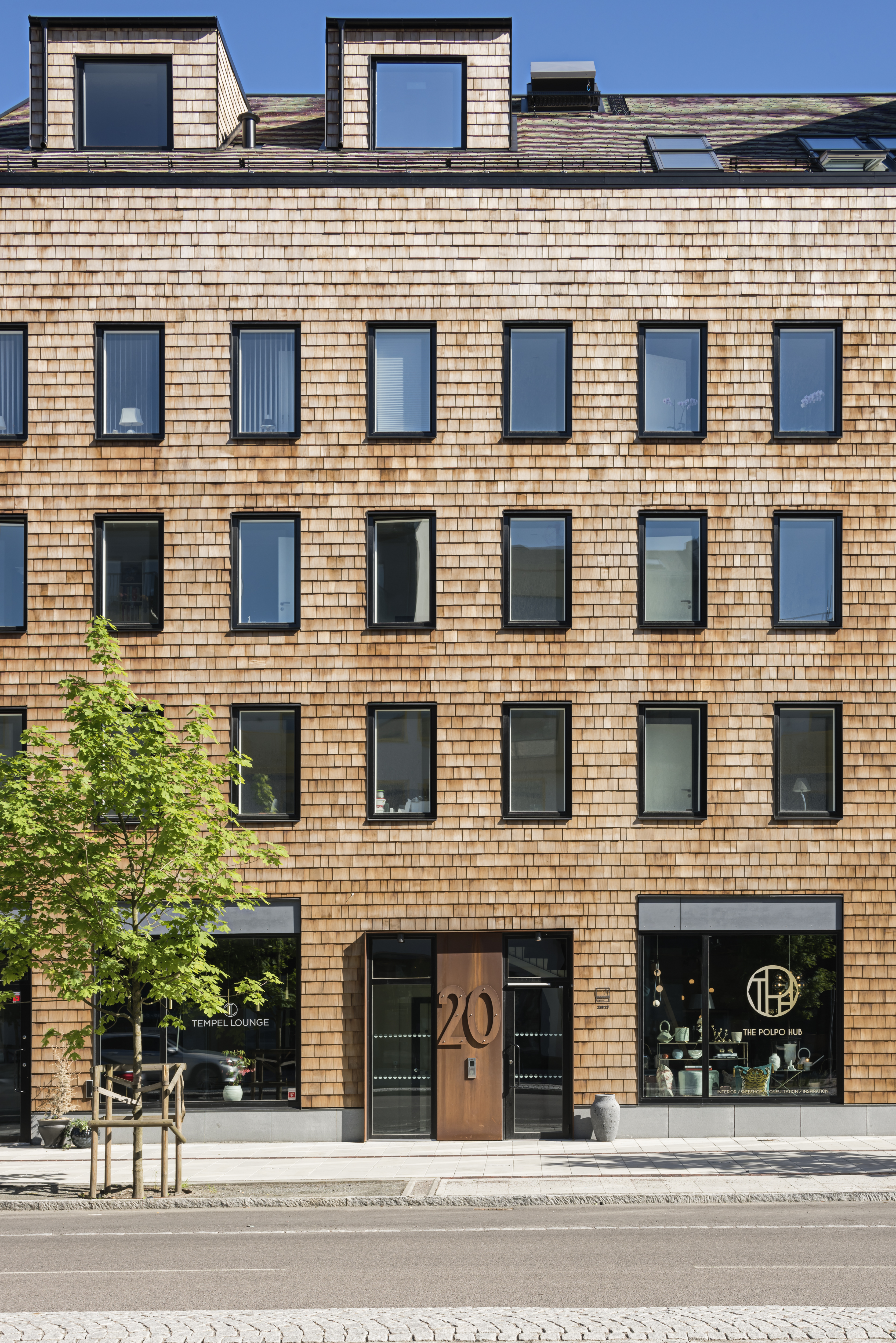 Från gatan ser byggnaden ut såhär. Cederträspån är ett väldigt smidigt material som man enkelt kan utnyttja till detaljer, utstickande delar och komplementsbyggnader.