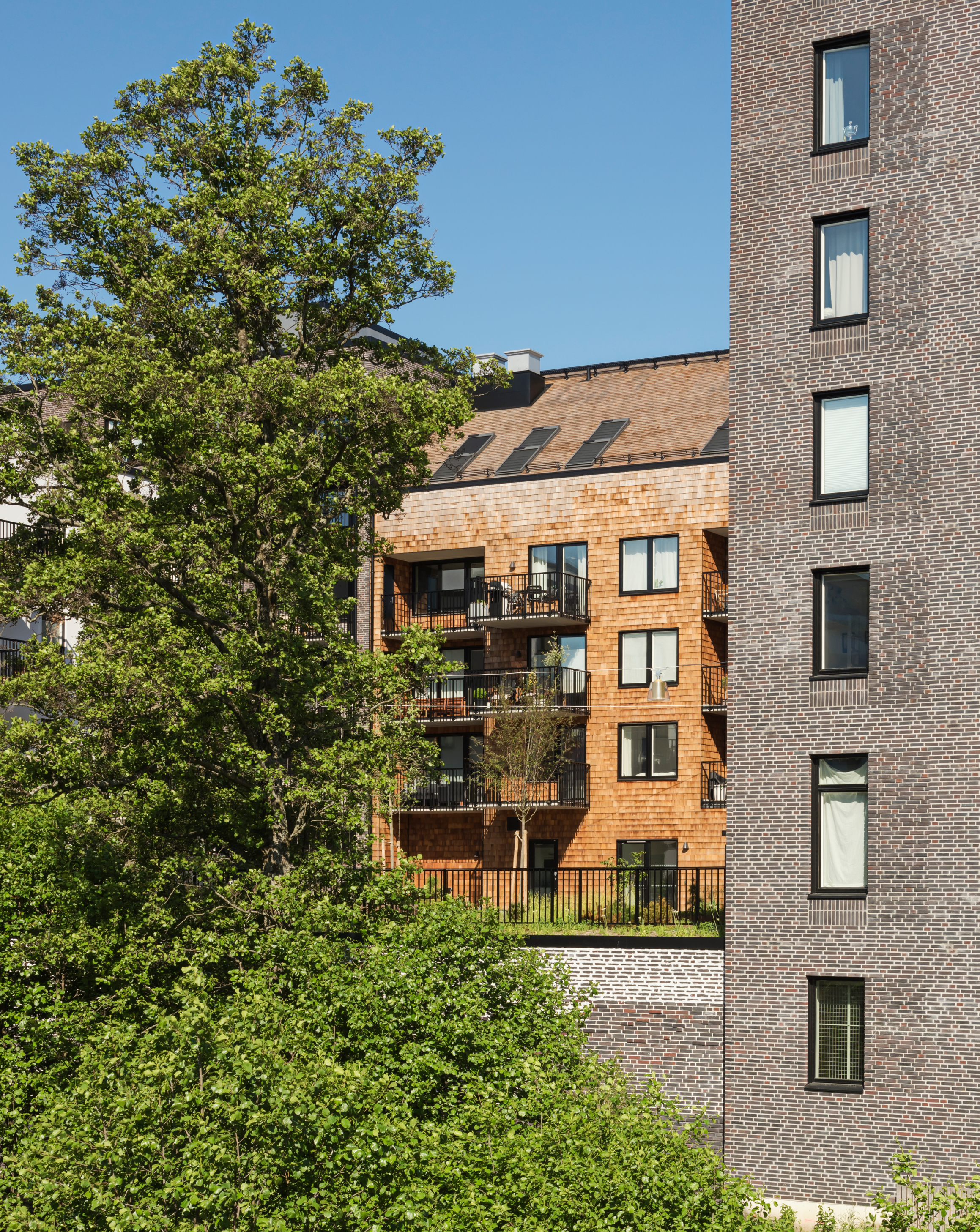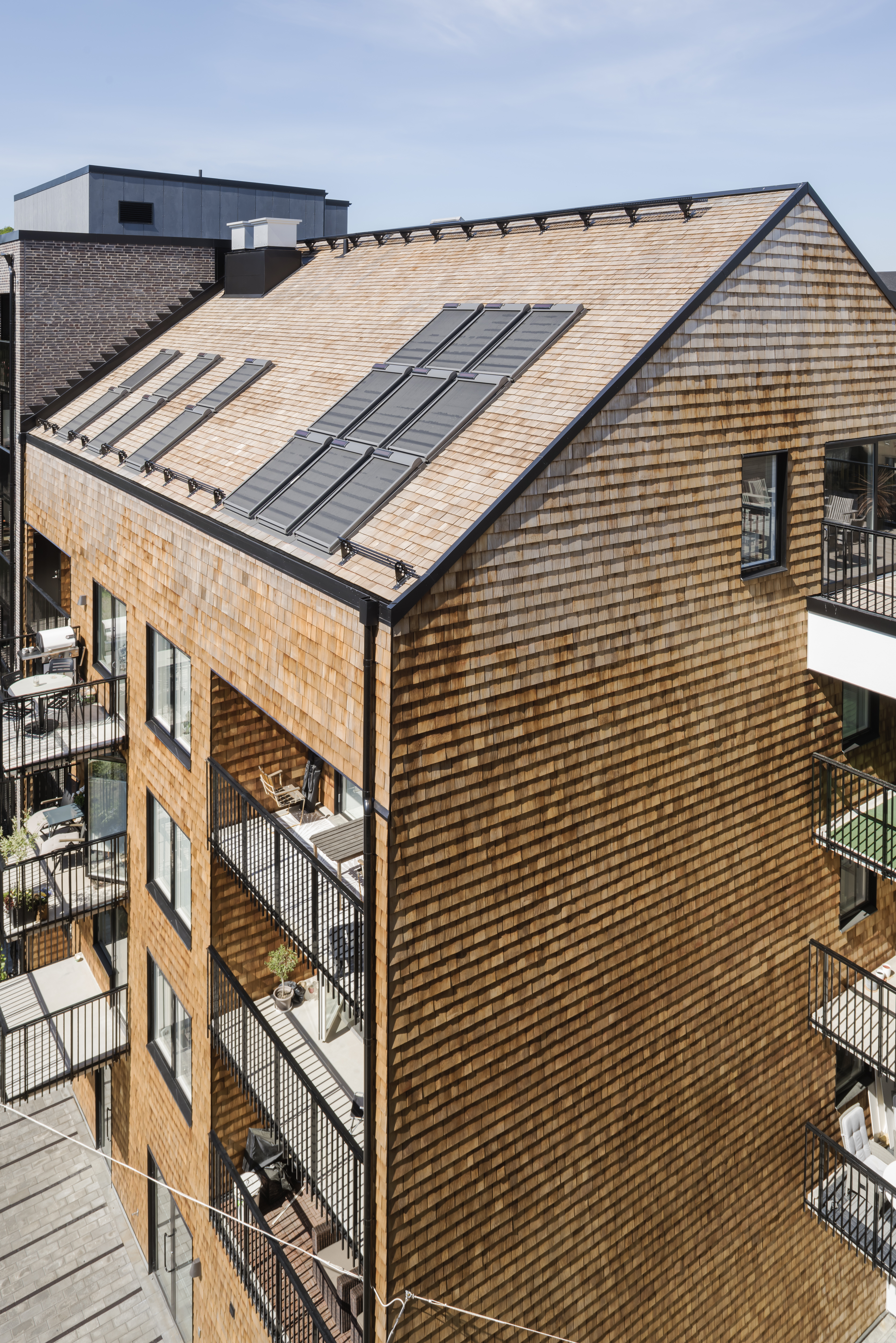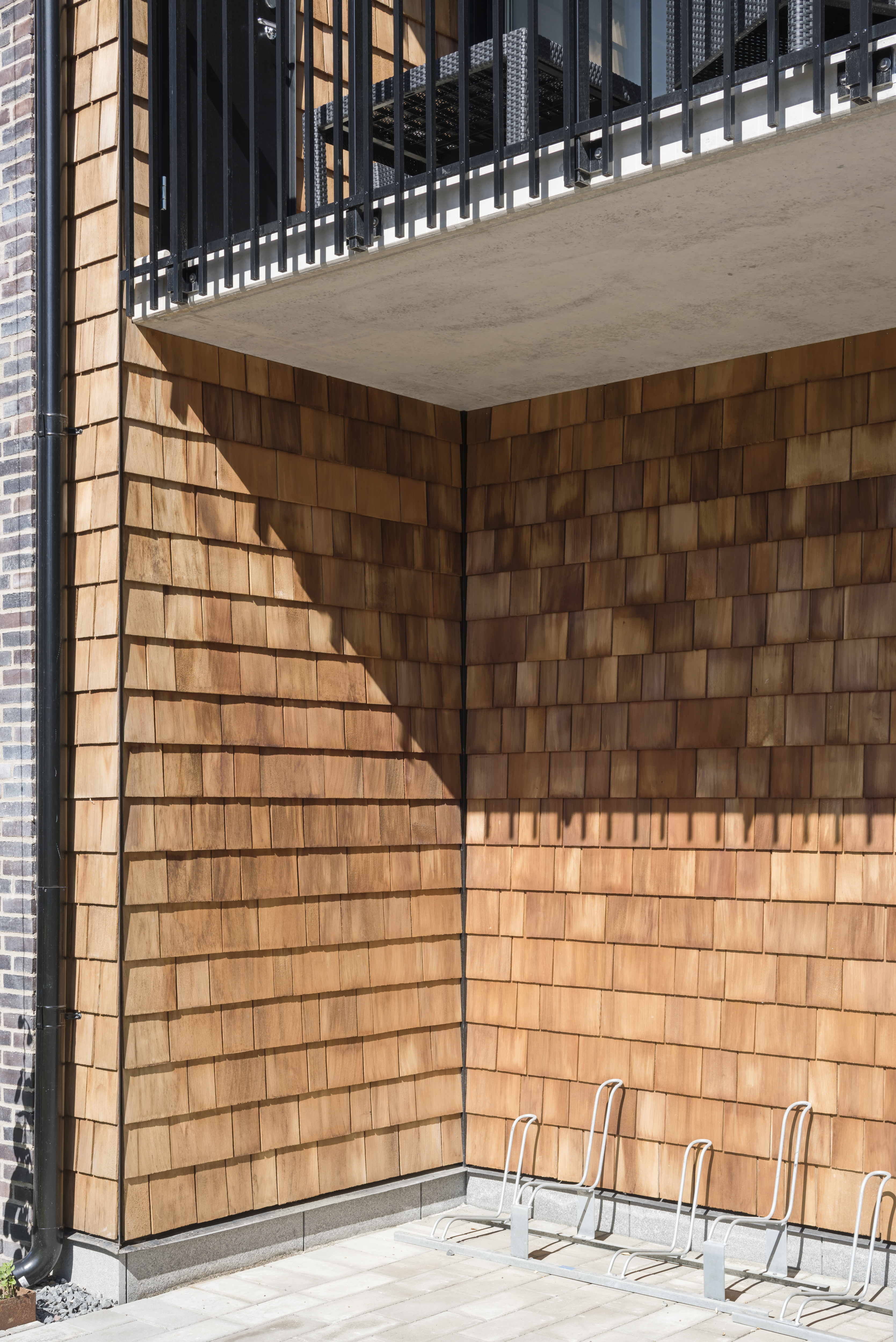 Cederträspån med brandklass SP Fire 105 på ett av de nybyggda flerbostadshusen i Nya Hovås. Nya Hovås är en stadsdel i Göteborgs södra delar. Ambitionen med stadsdelen är att det ska bli en levande småskalig blandstad i världsklass, med närhet till skog och hav.