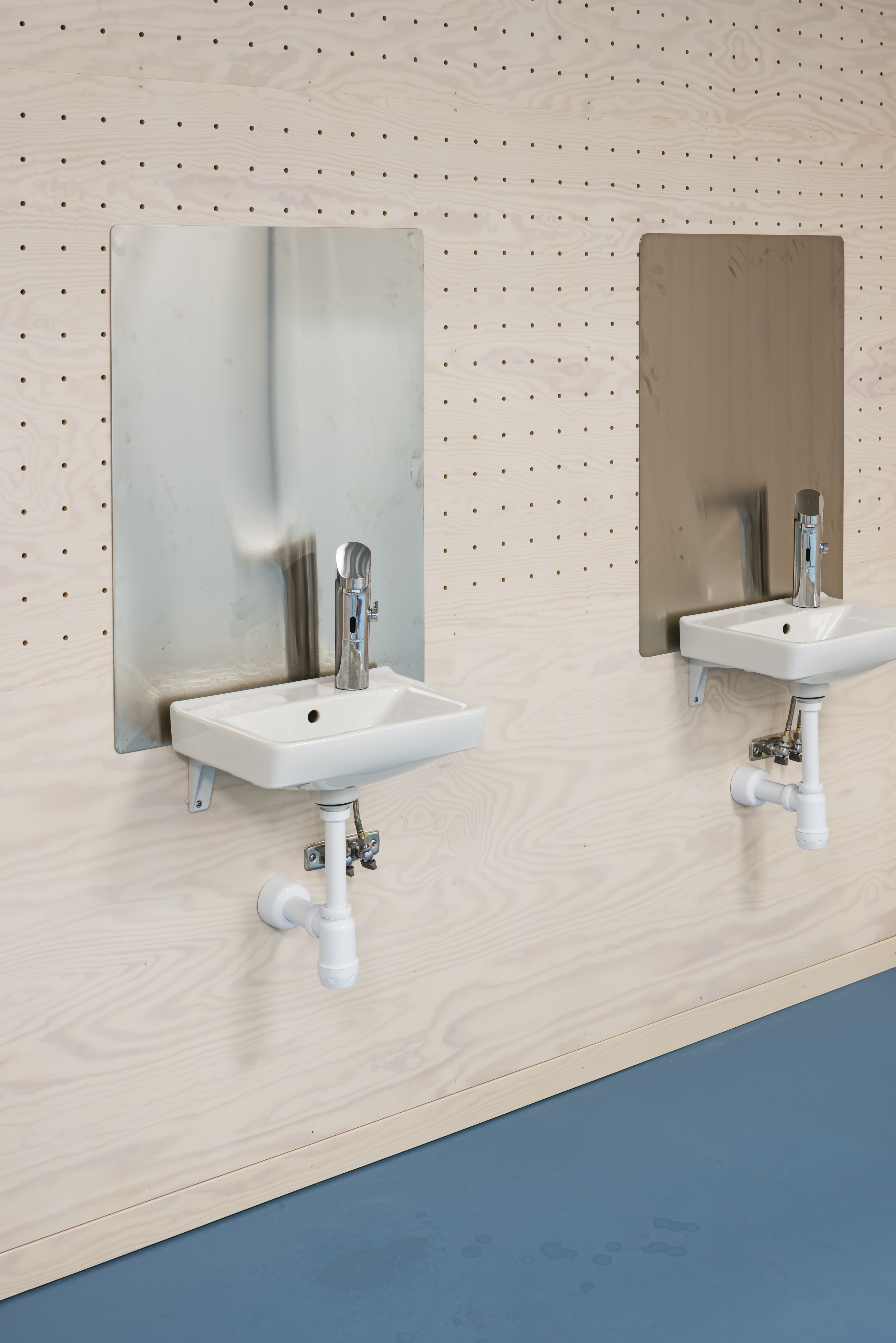Den synliga trästrukturen blir mer tydlig på släta skivor (ej perforerade) och vid mindre andel perforering. På furuplywood är fanéret och strukturen väldigt tydlig men den blir mindre framträdande om man väljer vår lacktyp extravit som har en hög andel vitpigment i sig, som man har valt i detta projekt.