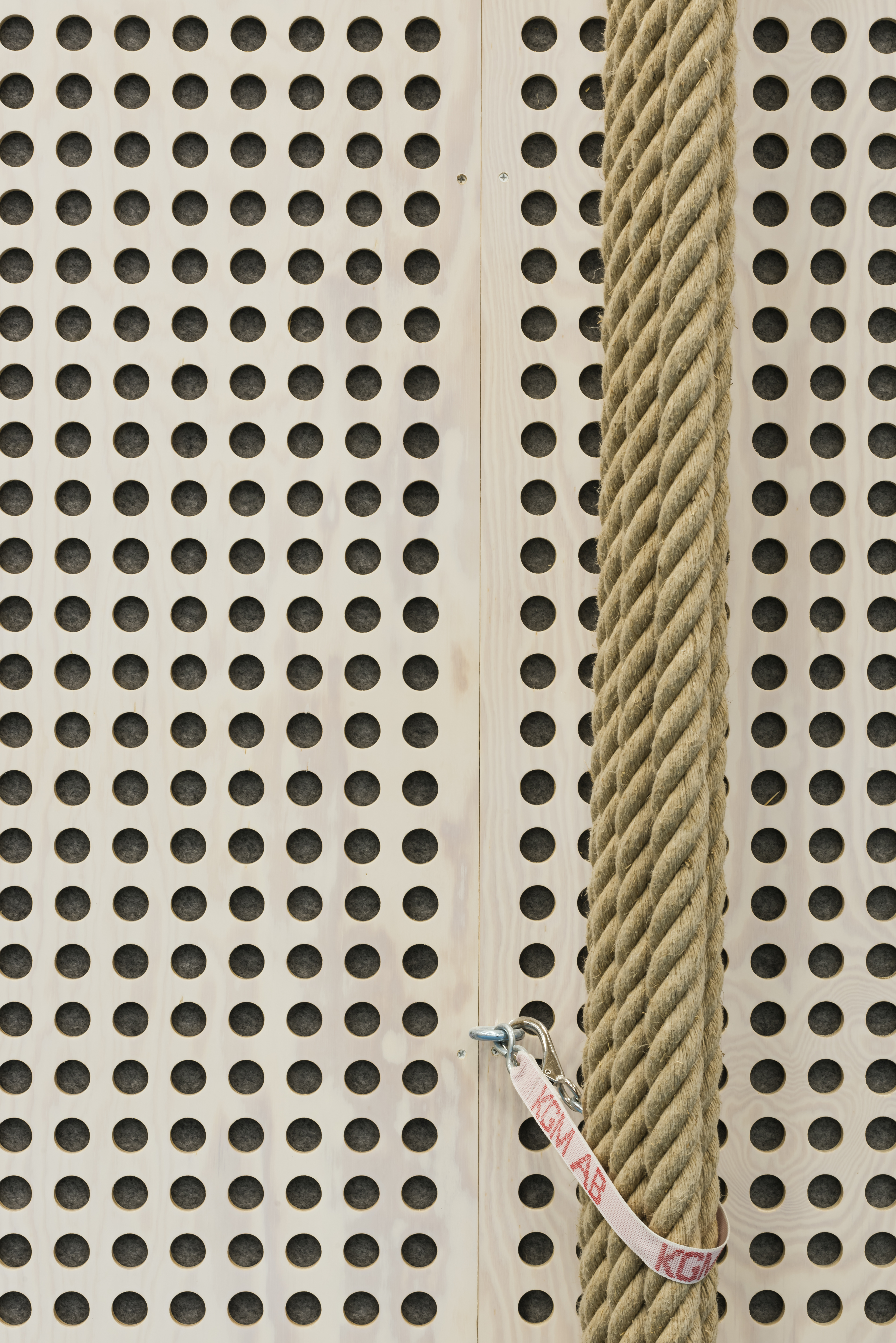 För att panelen skulle vara så kostnadseffektiv som möjligt valde man tre skivor i fullformat (2400mm) på höjden och sedan avslutade man med en slät skiva högst upp. Då har man enkelt kunna sågat till den släta skivan för snyggt avslut mot innertaket utan att riskera att behöva såga i de perforerade skivorna.