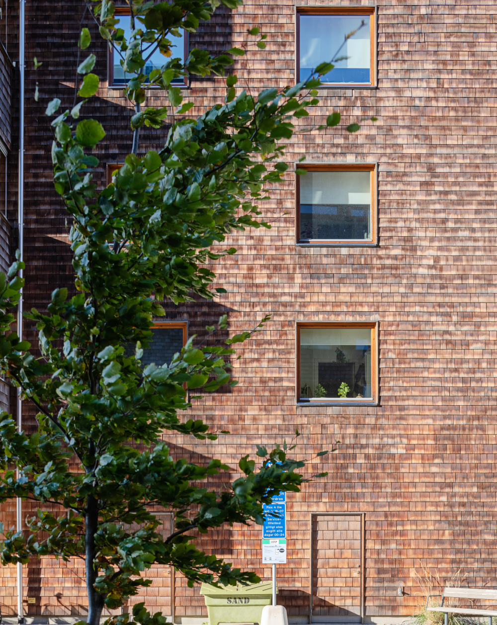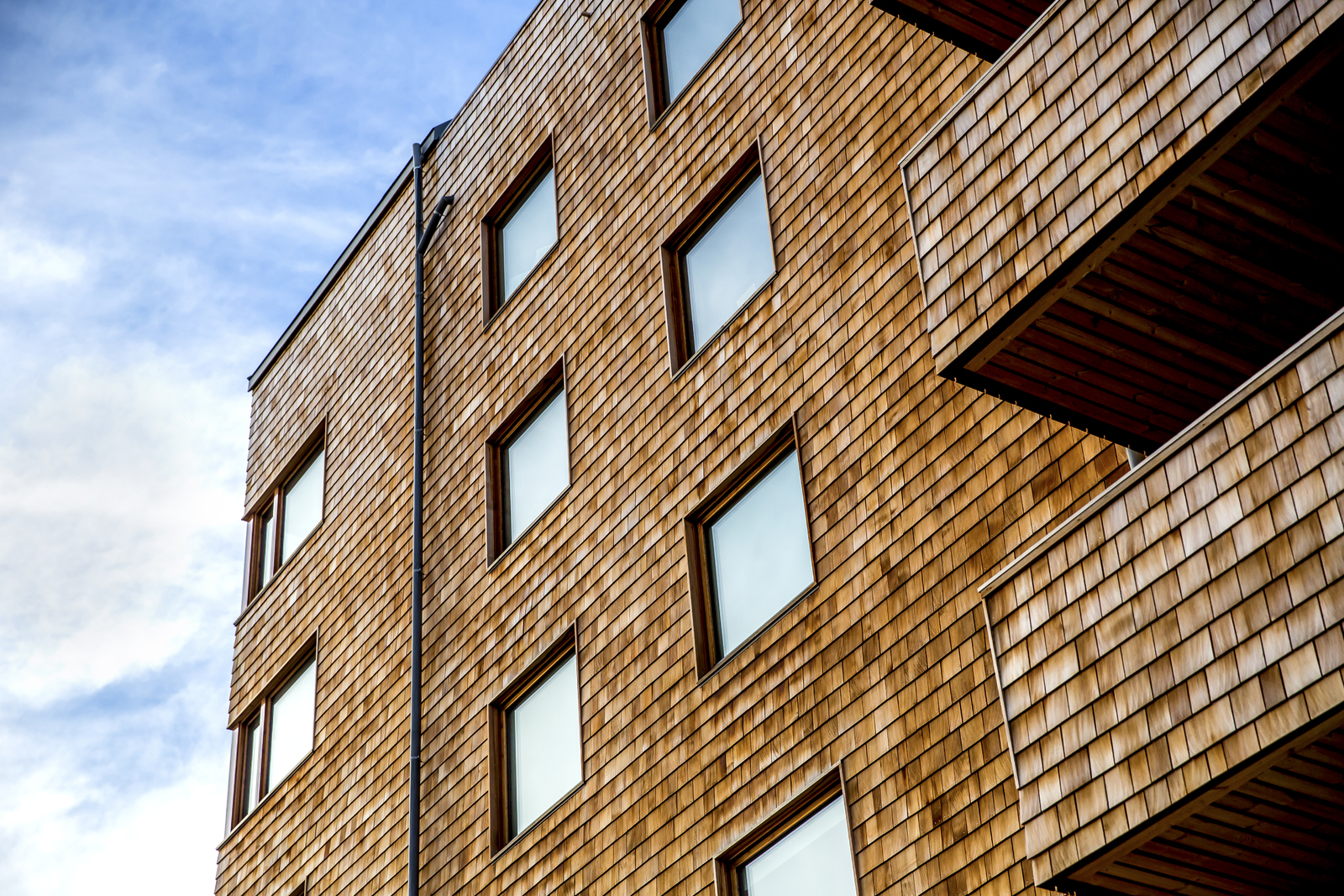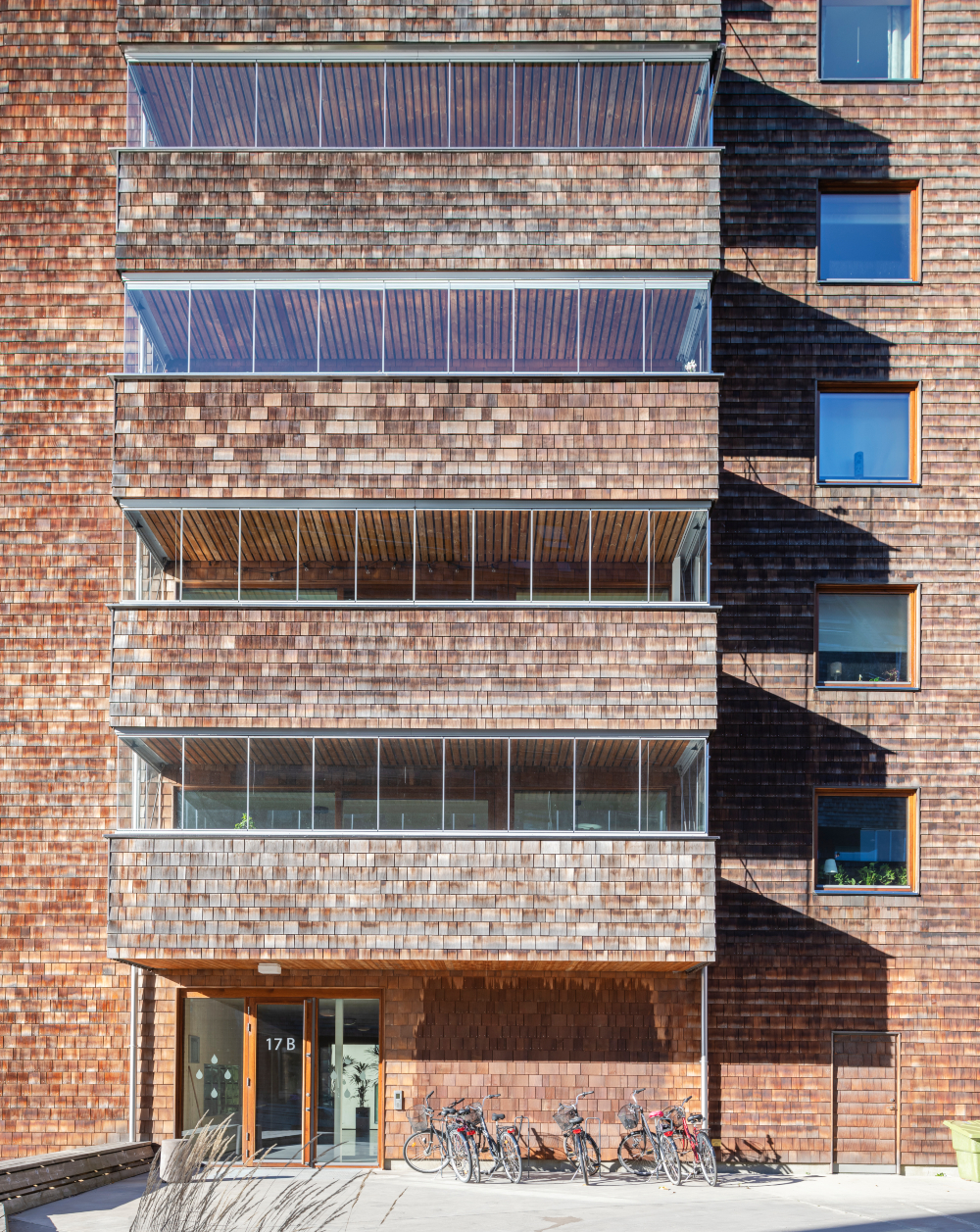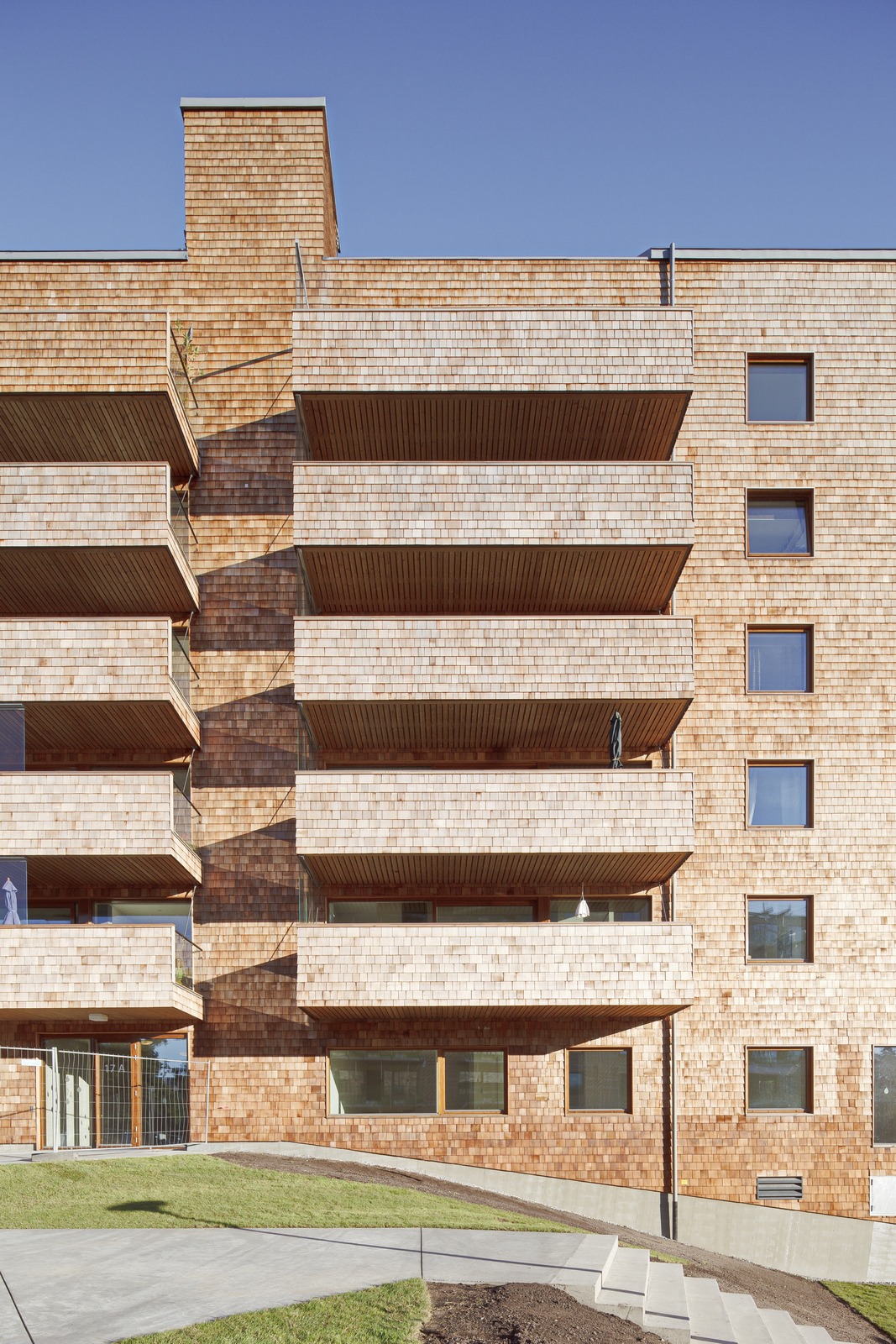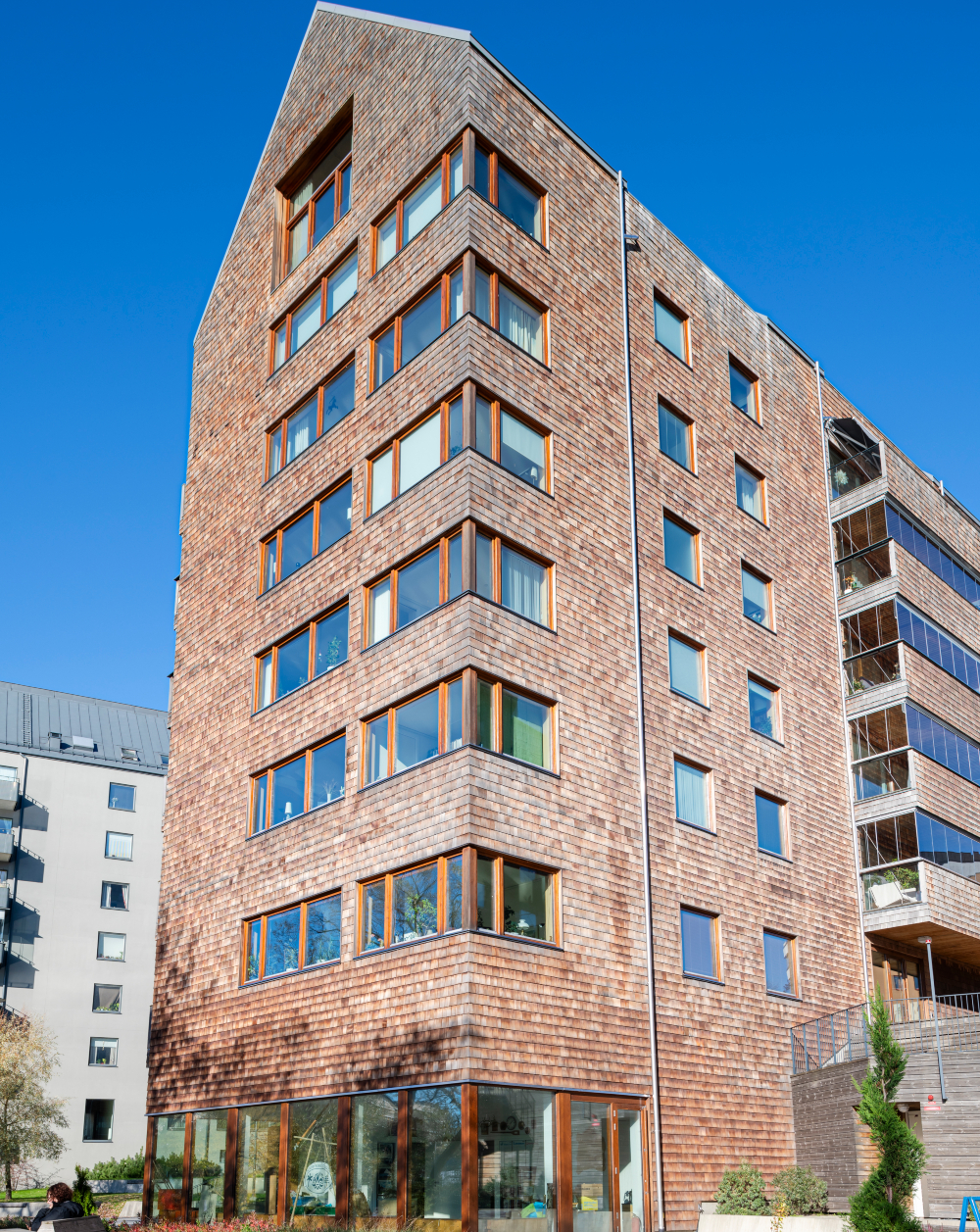 Åttavåningshus med trästomme. Cederträspån i kvistren kvalité ger byggnaden och dess exteriör en ekologisk look och ett livfullt utseende som syns på långt håll.