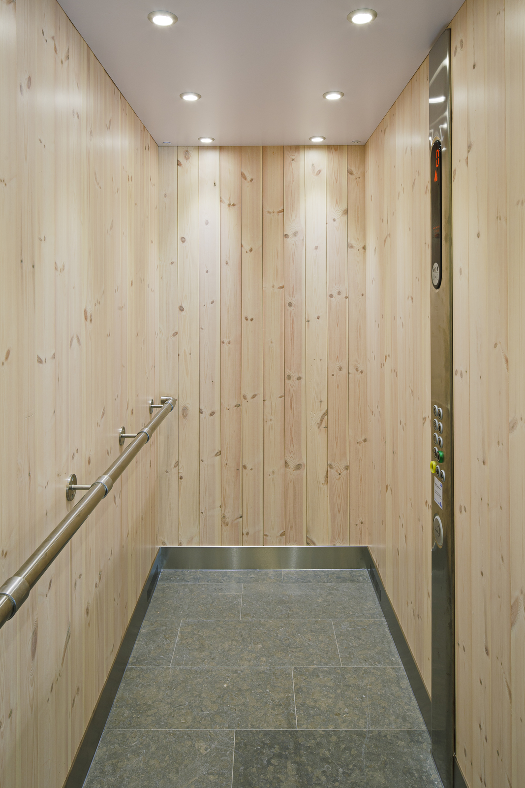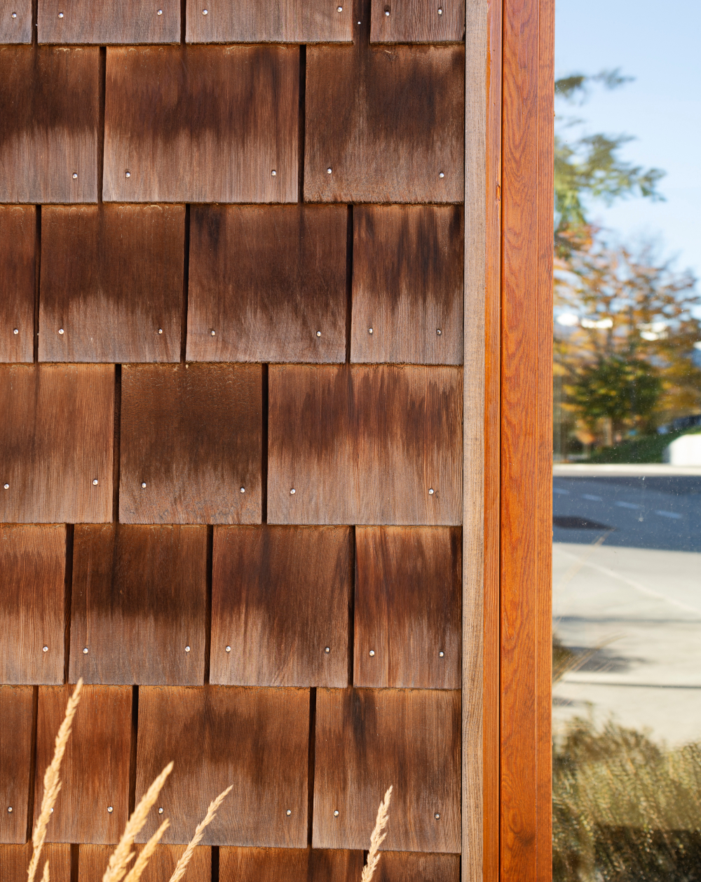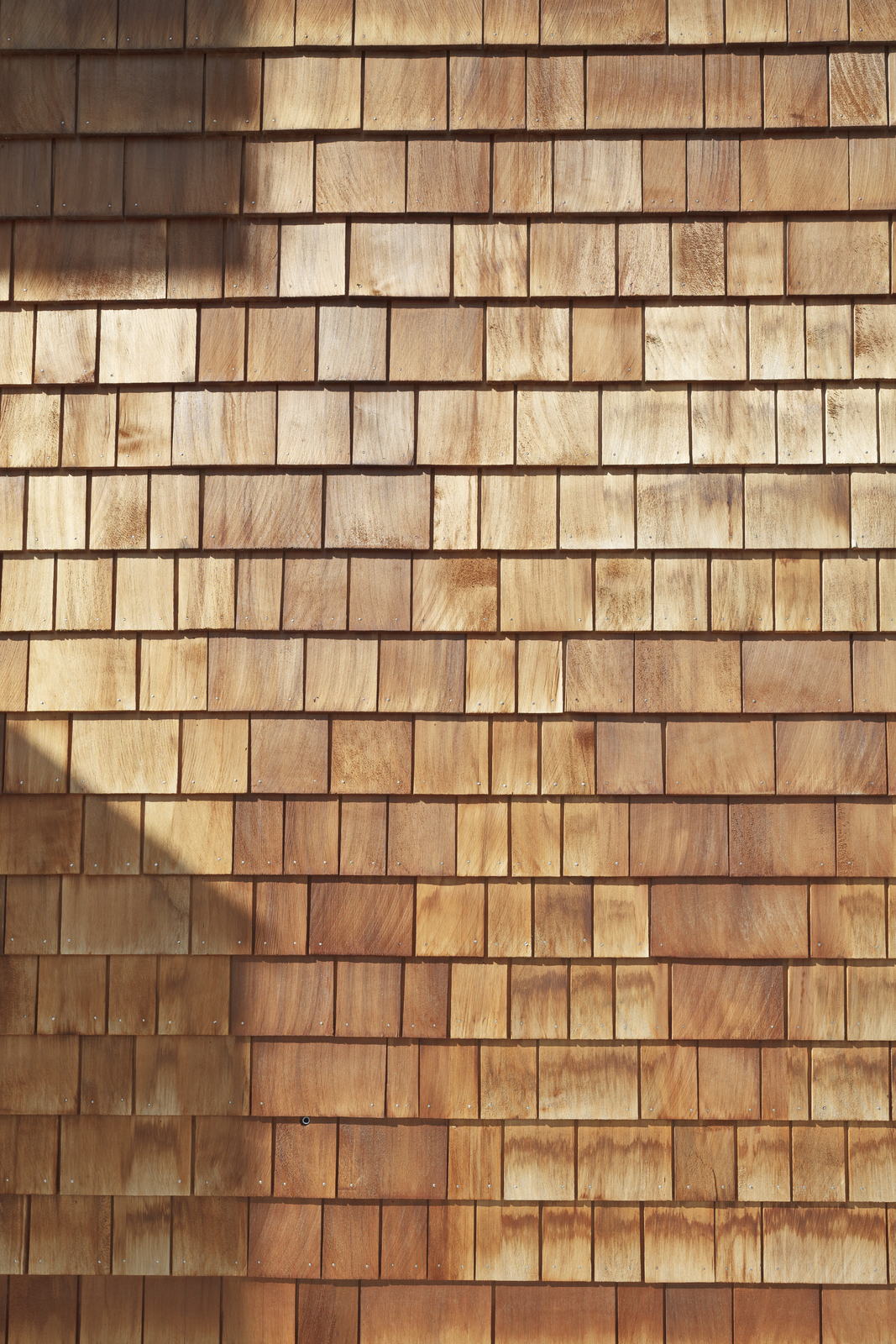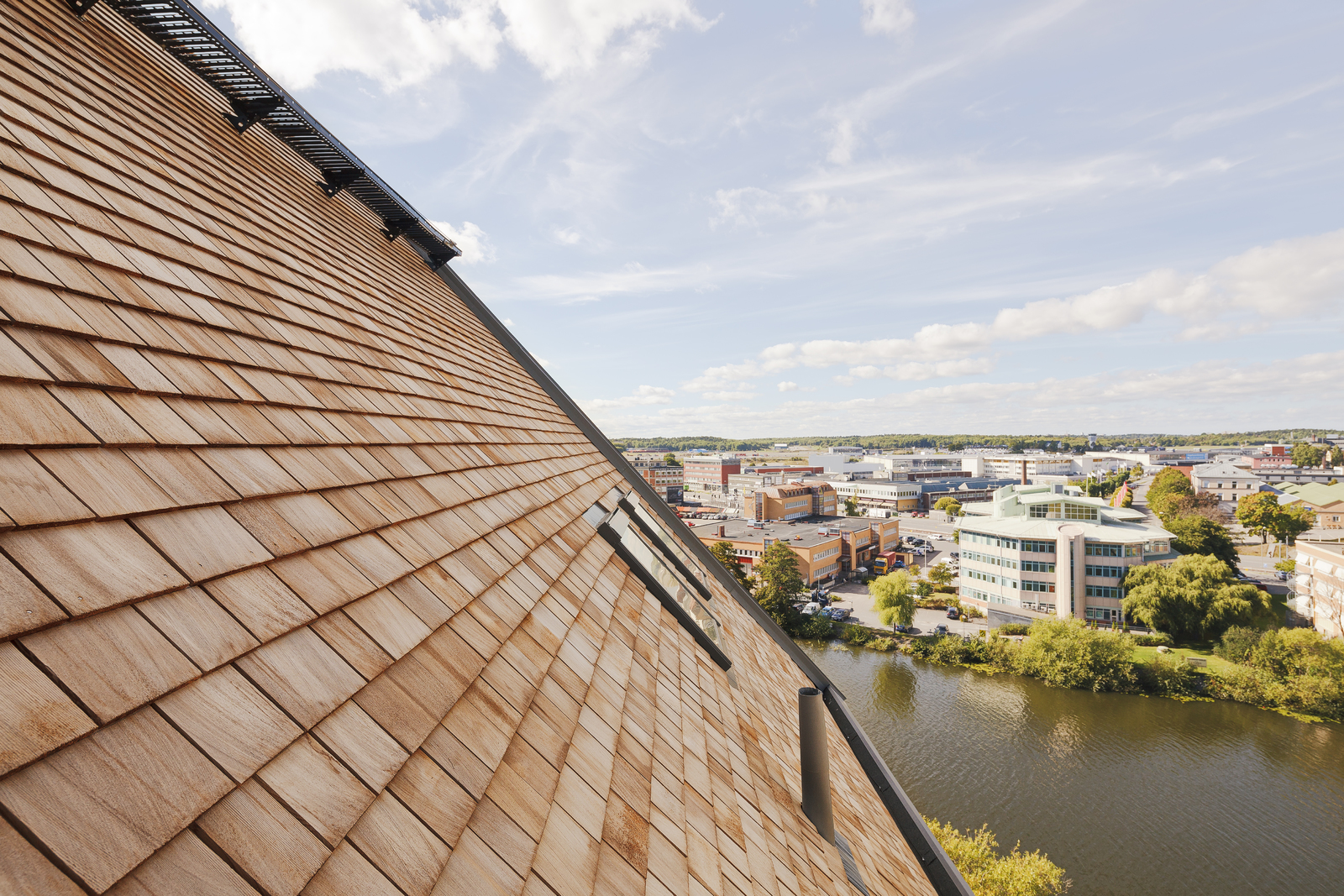 Cederträspånen på nedersta våningen och taket är brandskyddade med BT Brandskyddat Trä. En transparent vattenfast brandimpregnering som klarar brandskyddet under träets livslängd.