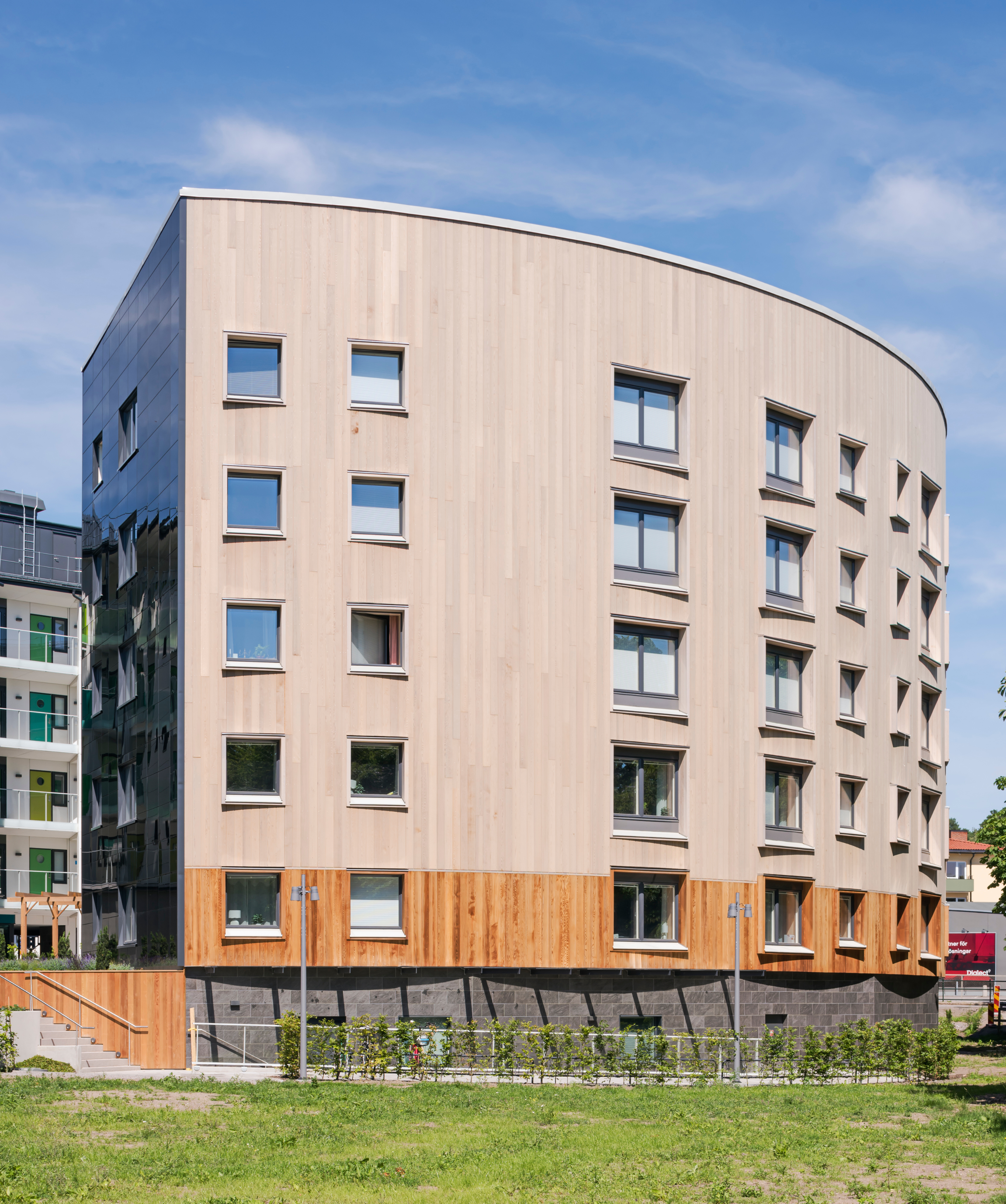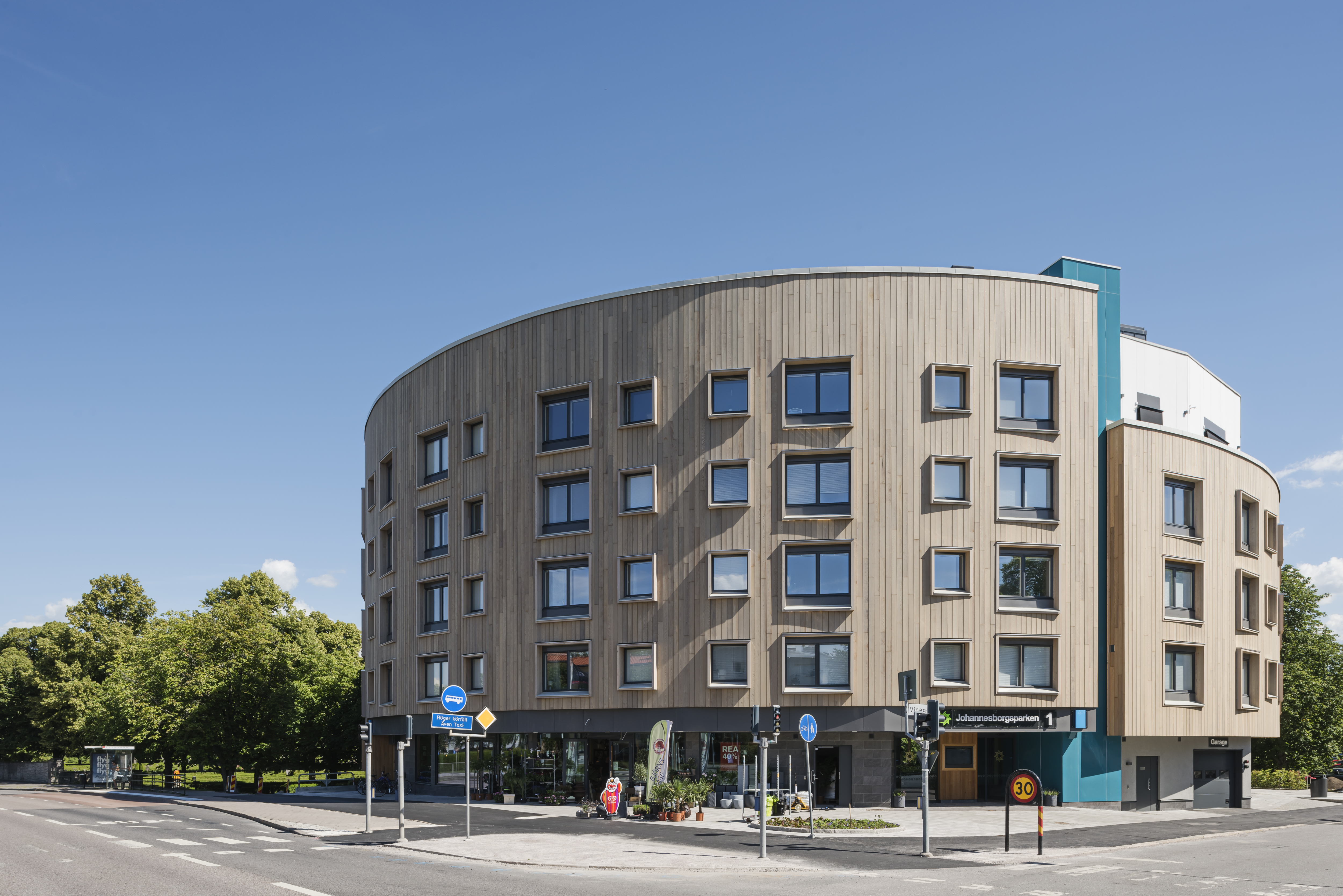 Hyresrättslägenheter med det lilla extra i en rolig form! Träbyggnaden är rund och beklädd med cederträpanel som är behandlad med patineringsolja som ger ett grånat utseende direkt från start.