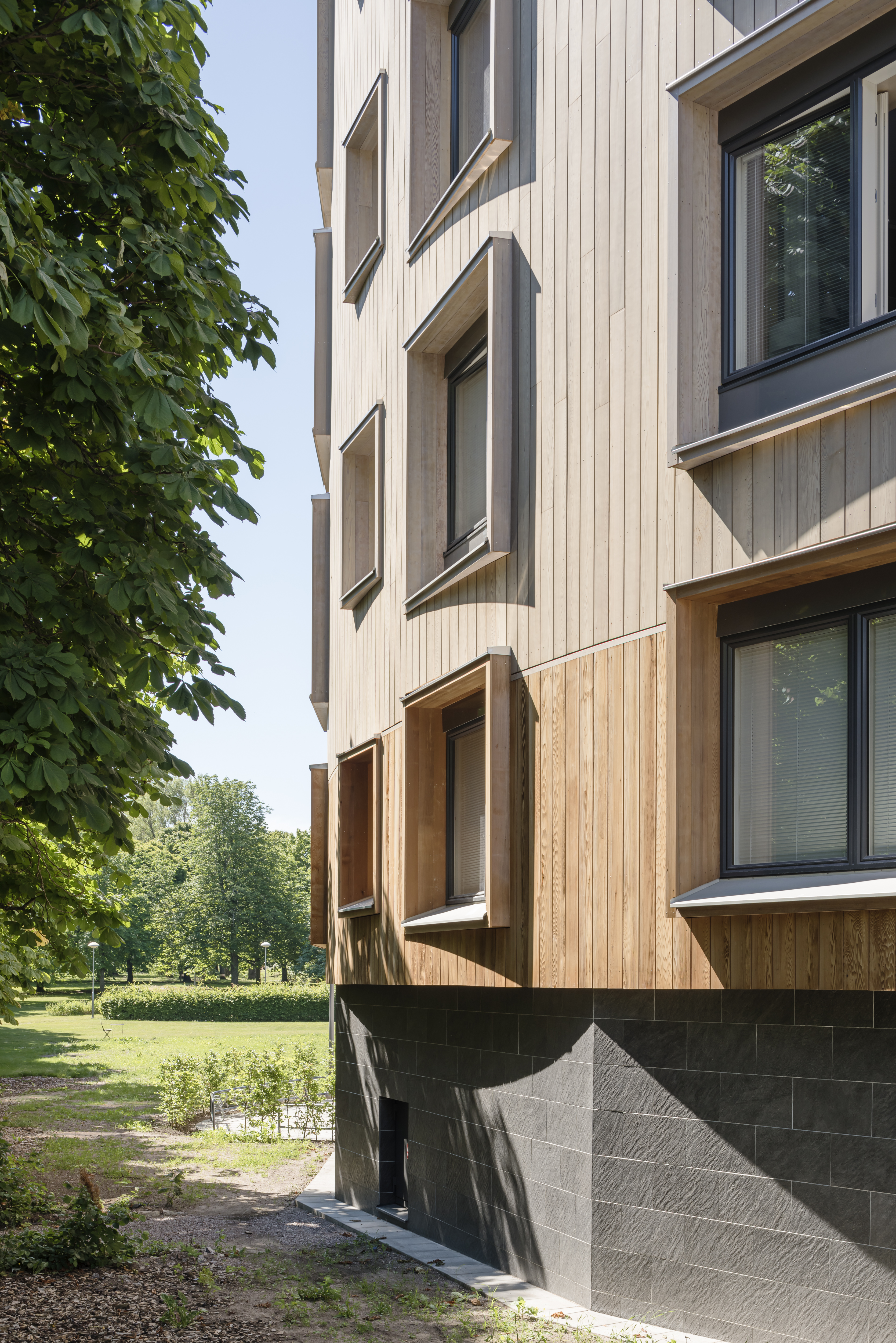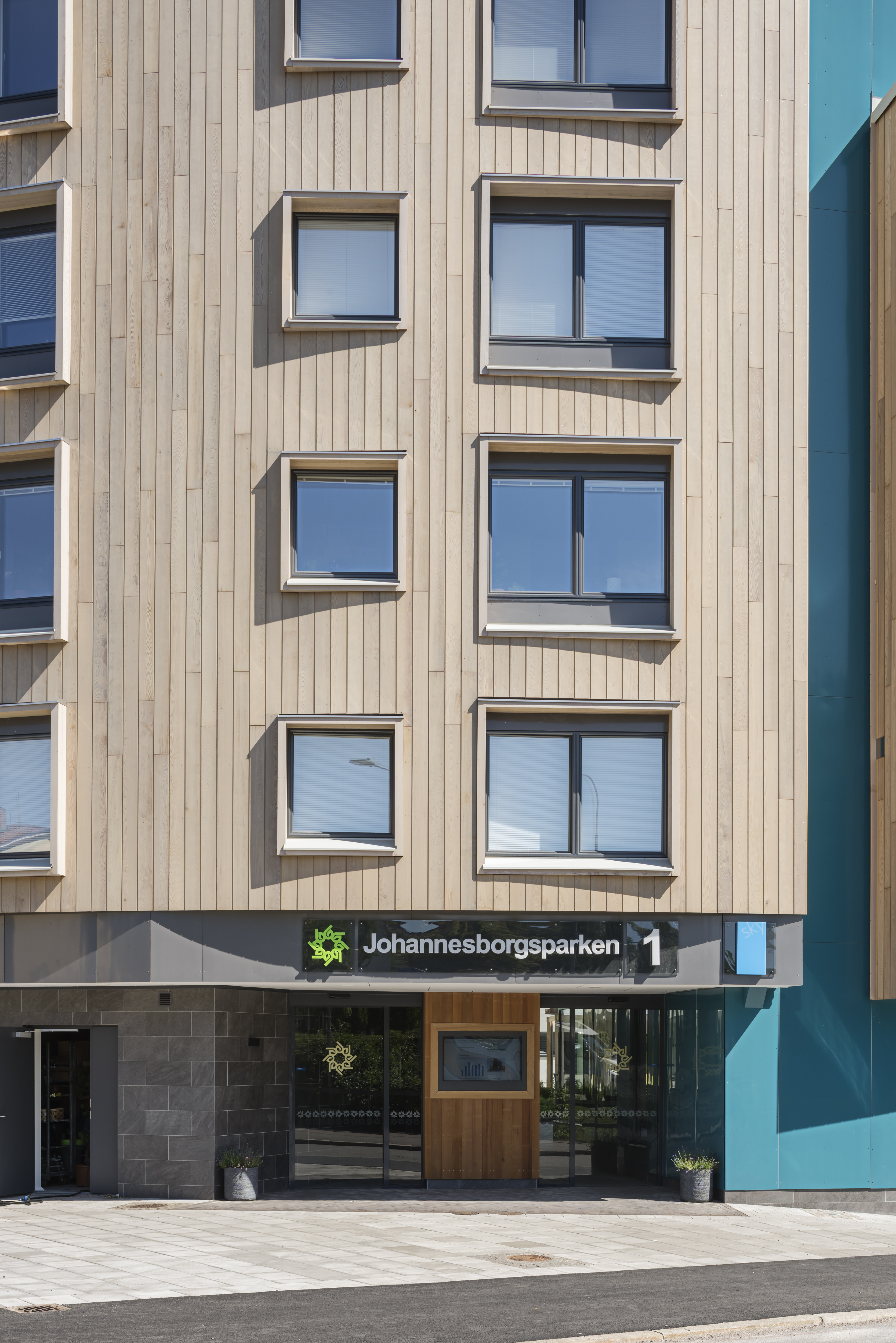 Fasaden är byggd med cederträpanel i dimension 17,5x143mm och 17,5x193mm. Man har valt två olika profiler: Profil 501 med ett rakt spår och profil 471 som är en slätspont. Cederträet på våning 2 till 5 är industriellt behandlat med Olja Premium 903, vilket gör att panelen får ett förpatinerat utseende. Den nedersta våningen är brandskyddsimpregnerad och har kvar cederträets naturliga kulör.